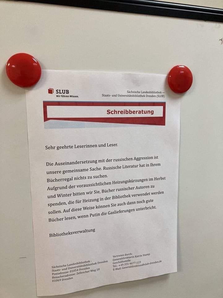 Zwischen August und September 2022 kursierte in sozialen Medien das Gerücht, die Staats- und Universitätsbibliothek Dresden (SLUB) und die Bücherhallen Hamburg würden zum Heizen russische Bücher sammeln: