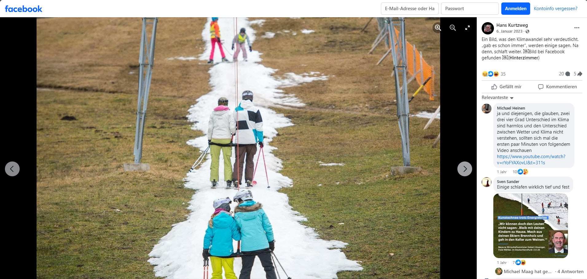 Fehlender Schnee beschäftigte die Schweiz im Winter 2022/2023. In diesem Facebook-Post eines Users zum Thema Klimawandel fehlen leider die Eckdaten zum Bild.