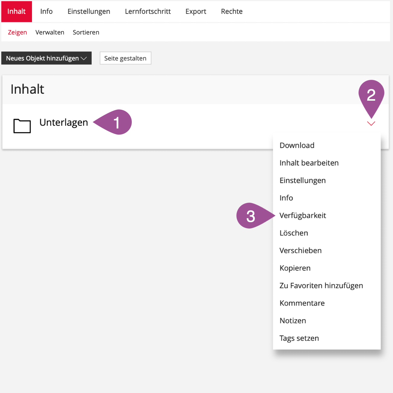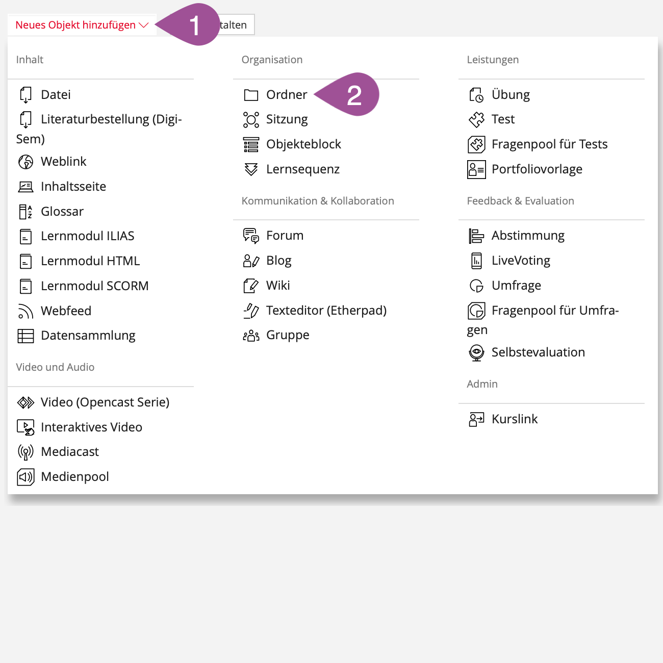 If you create a folder in your course, you can place further folders, objects and tools in this folder and make them available to your students. You can thus structure and provide your content in a folder structure.