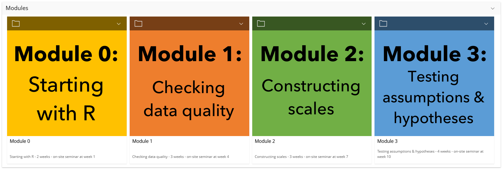 Im Methodenseminar „Datensatzaufbereitung in R“ im HS22 [1] haben wir den ILIAS-Kursraum als eLearning-Bereich aufbereitet, um das selbstständige Bearbeiten des Lernstoffs zu ermöglichen und mehr Teilnahmeplätze im Seminar zu schaffen (von 15 auf 45 Plätze). Studierende wurden in 3 Gruppen aufgeteilt. Jede Woche hatte eine andere Gruppe einen Präsenztermin, während die anderen Gruppen jeweils selbstständig die Module im ILIAS-Kursraum absolvierten.