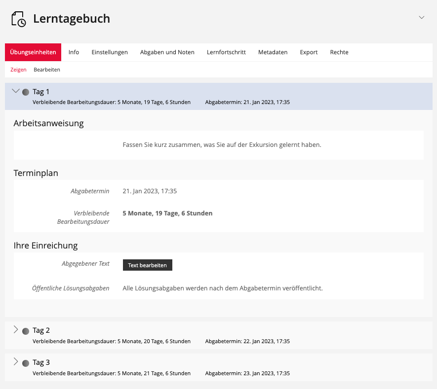 - In the exercise, one assignment of the type "Text" is created for each journaling day