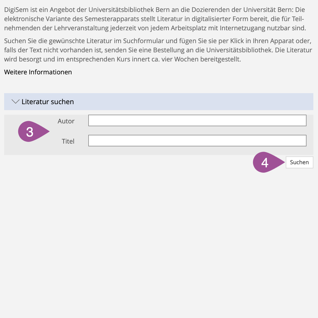 Werden keine Resultate zu Ihren Suchworten gefunden, ist die Literatur noch nicht in DigiSem vorhanden. Sie können eine Bestellung für die gewünschte Literatur aufgeben. Bitte beachten Sie, dass es bis zu vier Wochen dauern kann, bis die Literatur von der Universitätsbibliothek besorgt und im ILIAS-Kurs bereitgestellt werden kann.