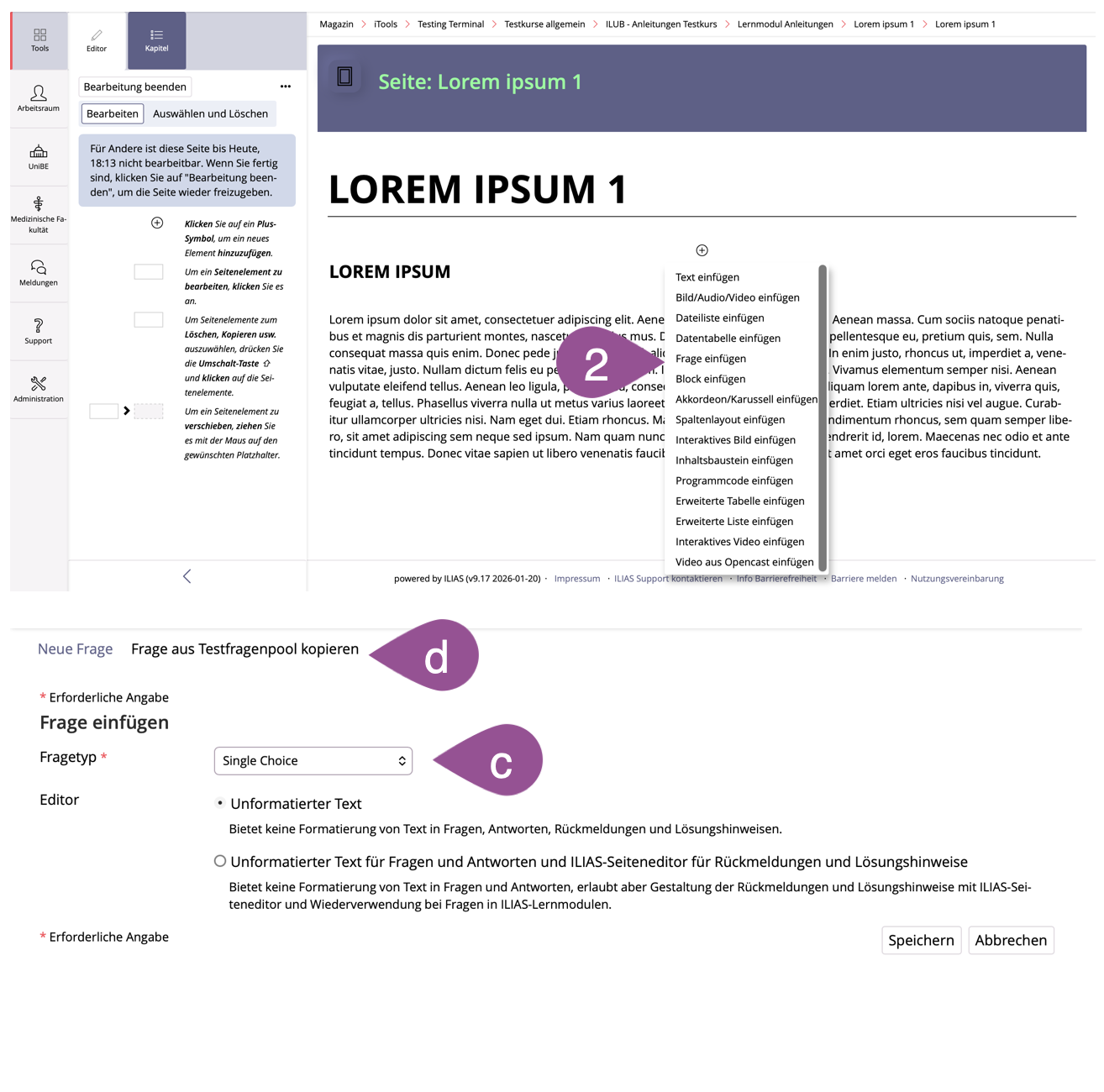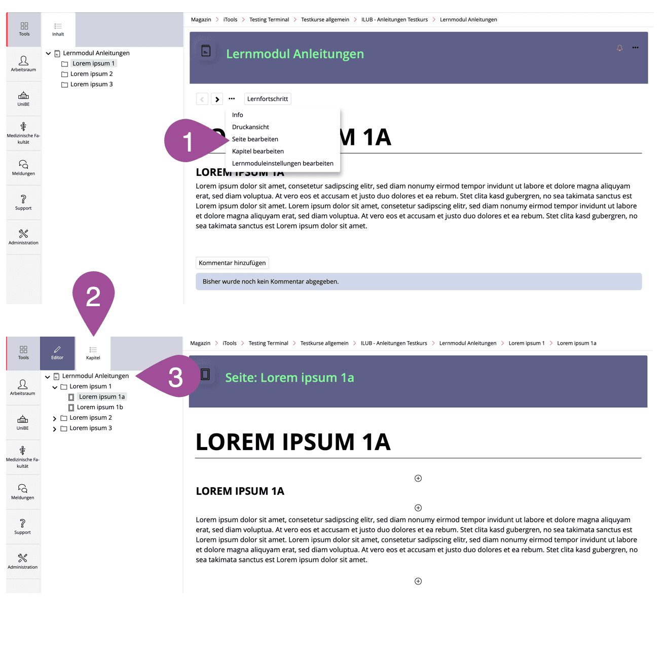 Lerninhalte werden innerhalb einer Seite im Register «Unterkapitel und Seiten» angelegt. Sie haben zwei Möglichkeiten: