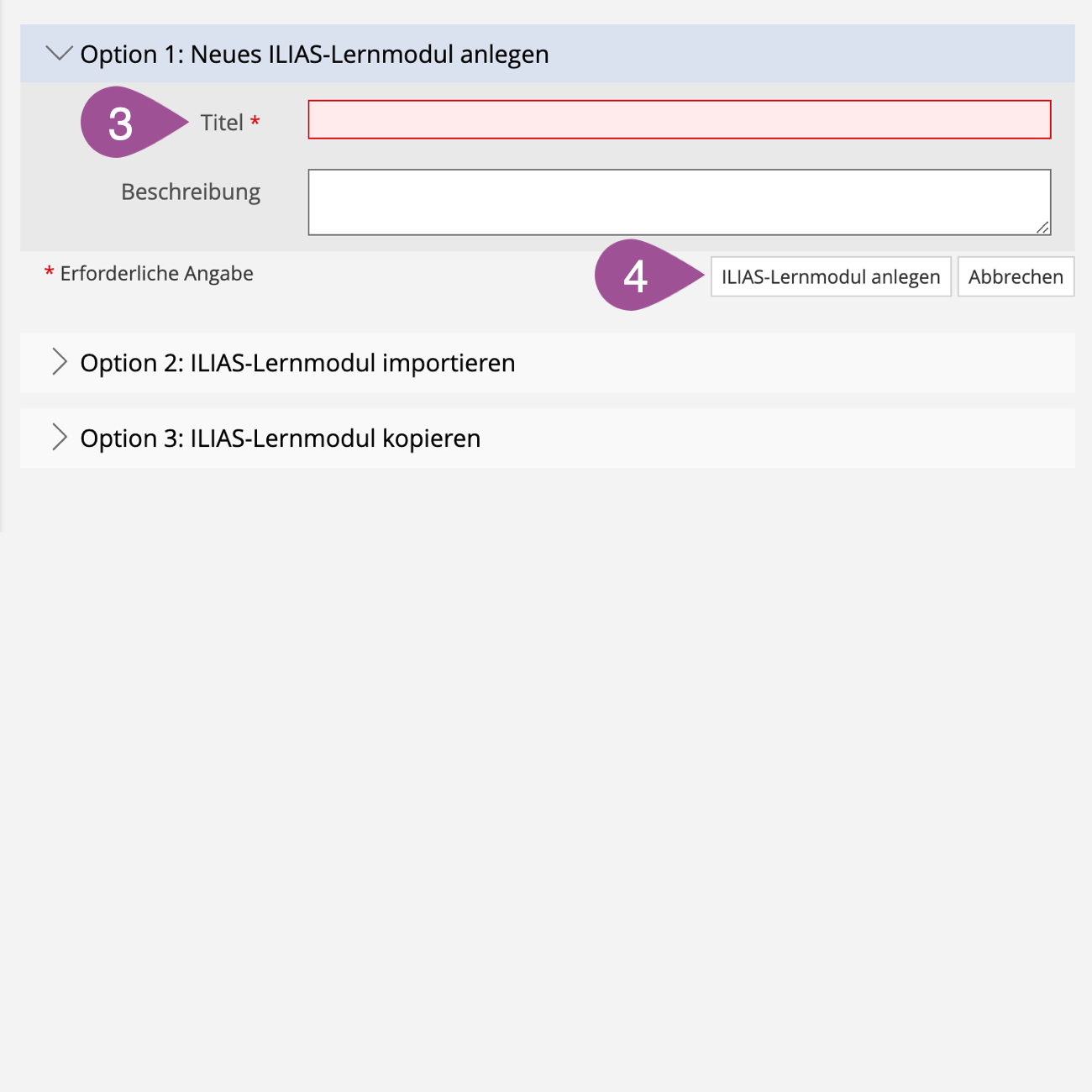 Klicken Sie auf «ILIAS-Lernmodul anlegen». |