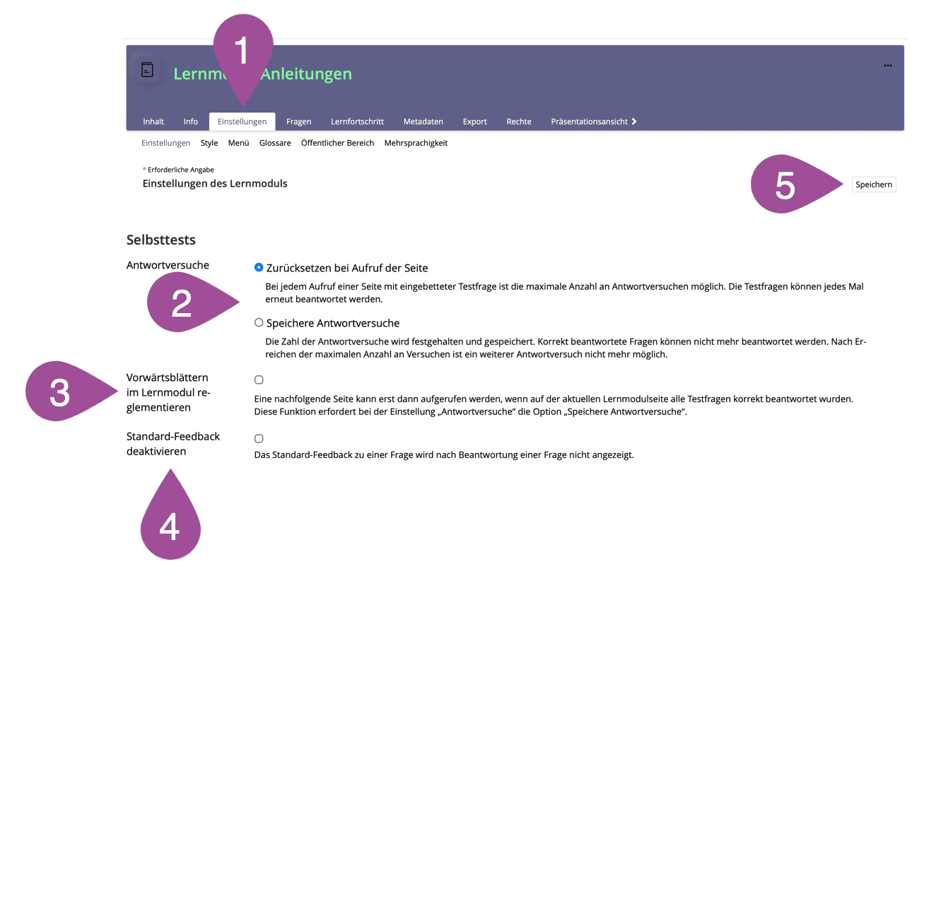 In einem Lernmodul können Sie auf jeder Seite eine oder mehrere Fragen mit Feedback einfügen (siehe 4.3 Lerninhalte platzieren), anhand derer die Studierenden prüfen können, ob sie die Inhalte verstanden haben. Im Bereich «Selbsttests» in den Einstellungen können Sie festlegen, welche Eigenschaften diese Fragen haben sollen.