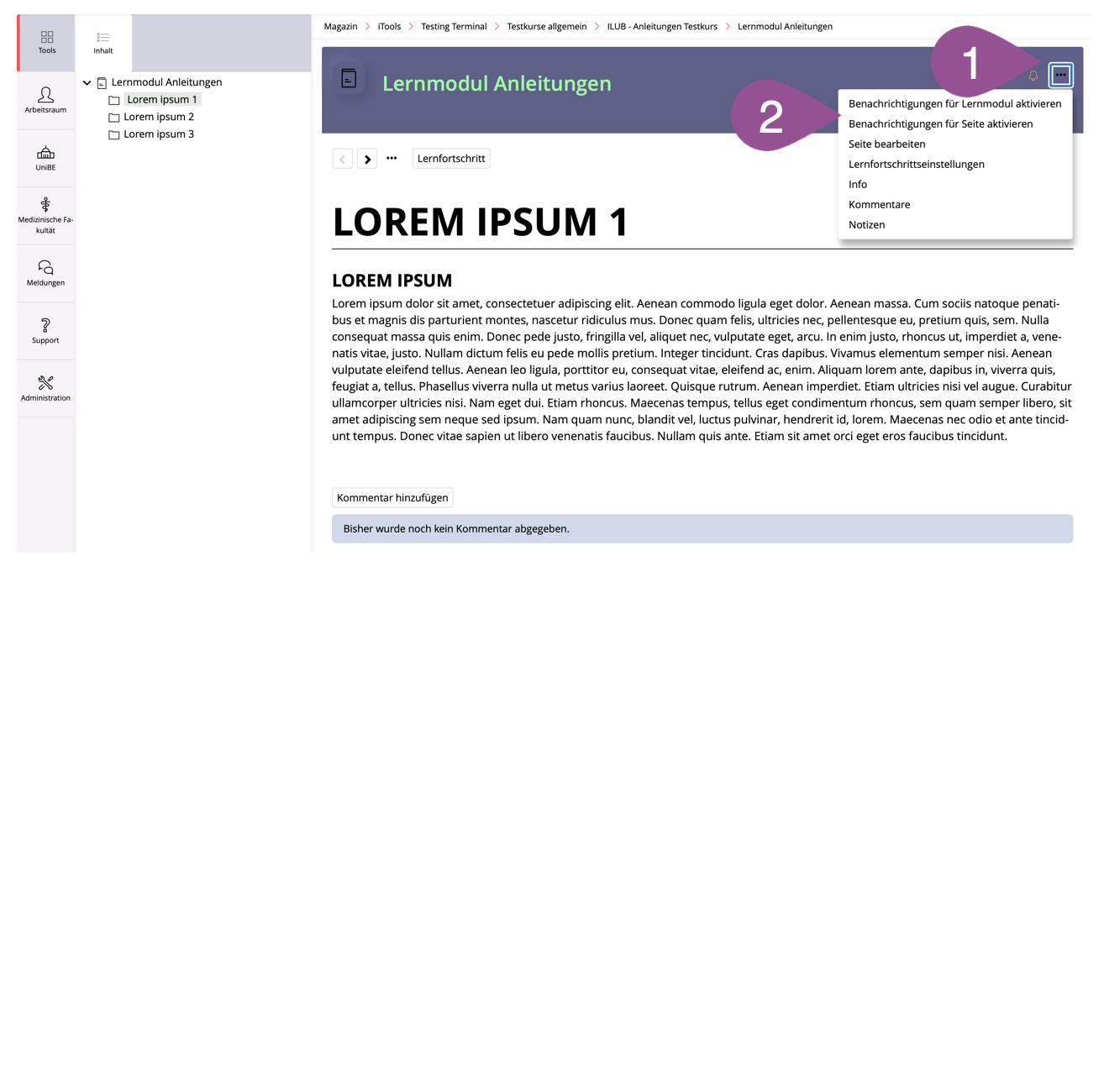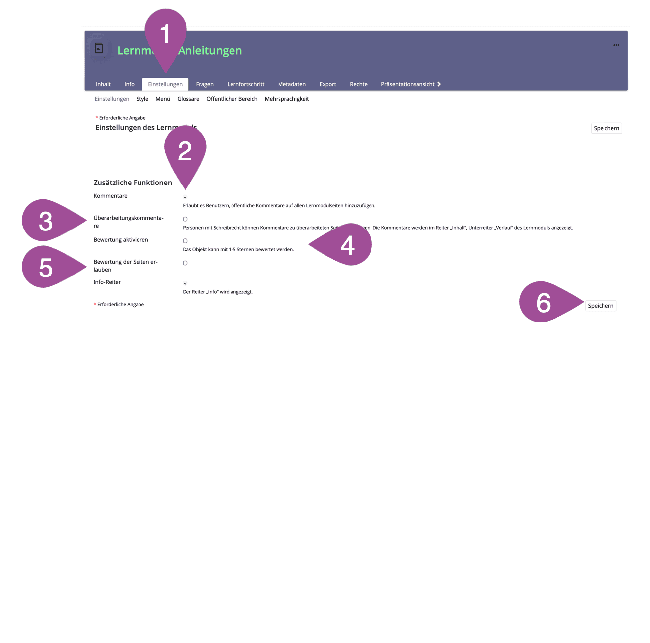Wenn aktiviert, können Benutzer:innen Kommentare zu allen Lernmodulseiten hinzuzufügen. | |