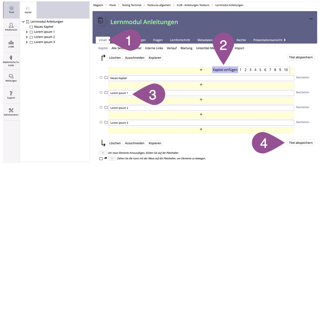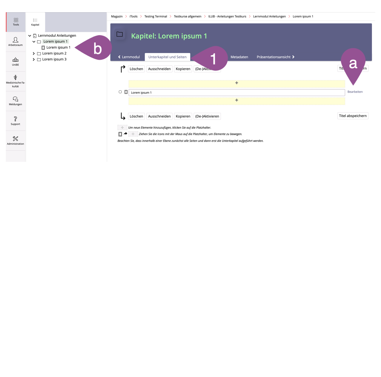 Um Lernmodule mit Inhalten zu füllen, werden zuerst einzelne «Kapitel» angelegt und anschliessend in diesen Kapiteln «Seiten» generiert, auf denen in einem letzten Schritt die Lerninhalte platziert werden. Dabei ist zu beachten, dass für Studierende nur jene Seiten zugänglich sind, die auch einem Kapitel zugeordnet sind.