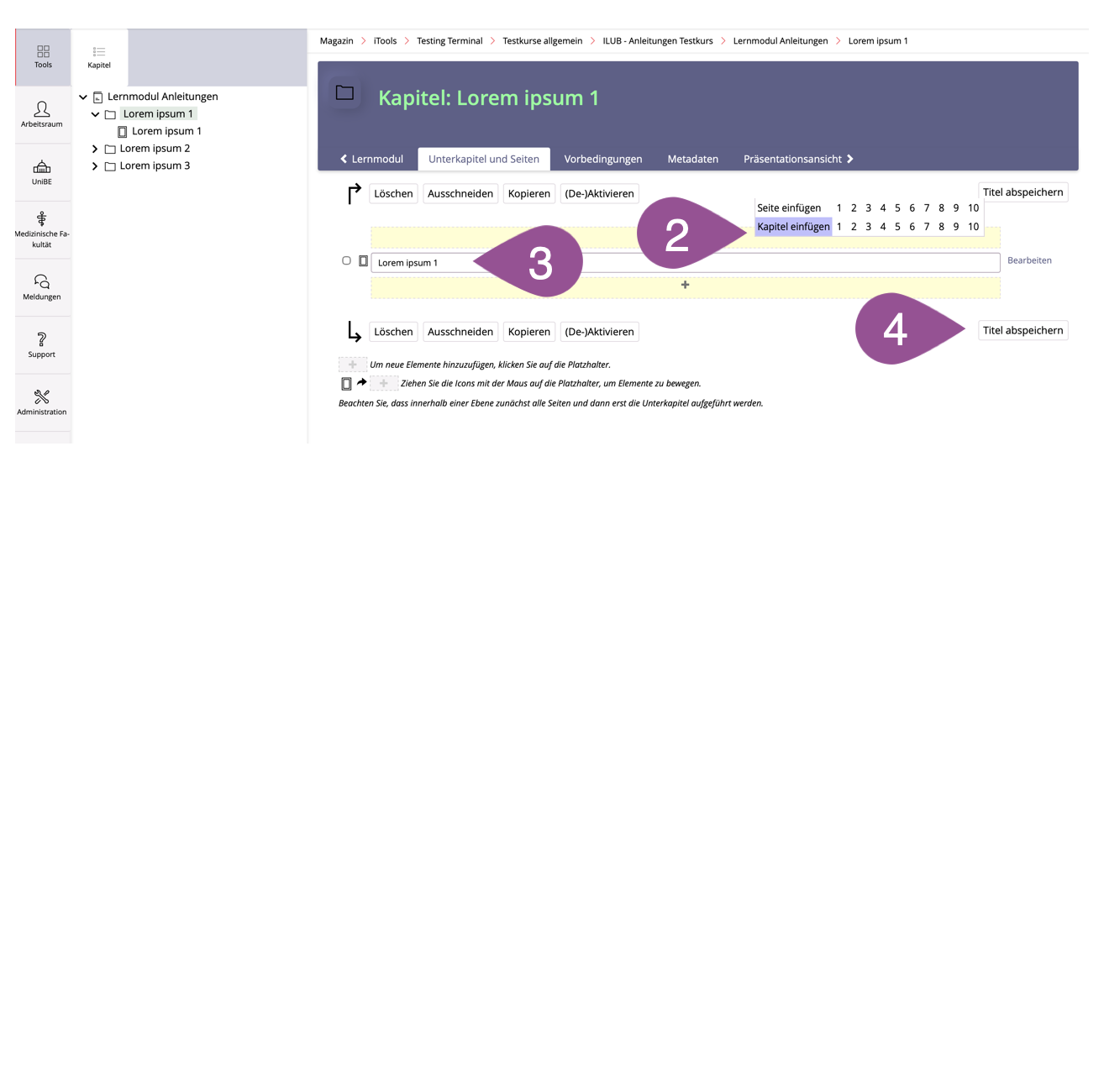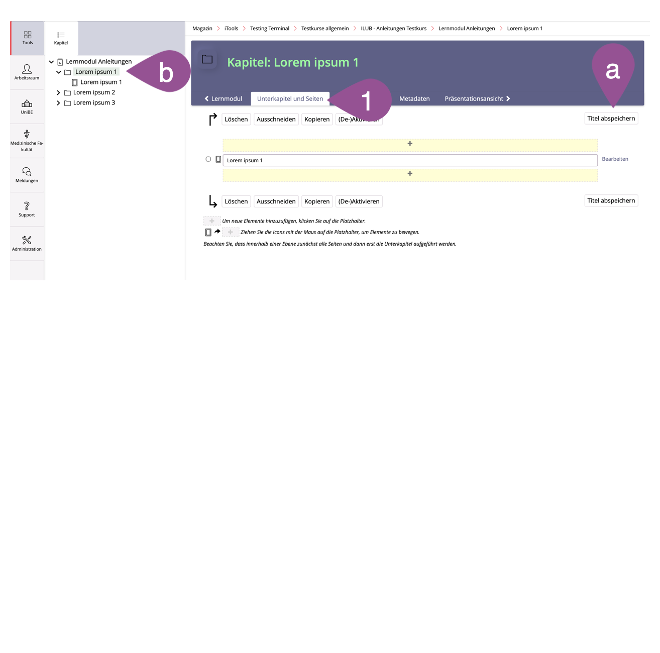 Geben Sie jedem Unterkapitel und jeder Seite einen «Titel». Ob dieser Titel im Lernmodul angezeigt wird, richtet sich nach den Einstellungen des Lernmoduls (siehe 3. Einstellungen anpassen). | |||||