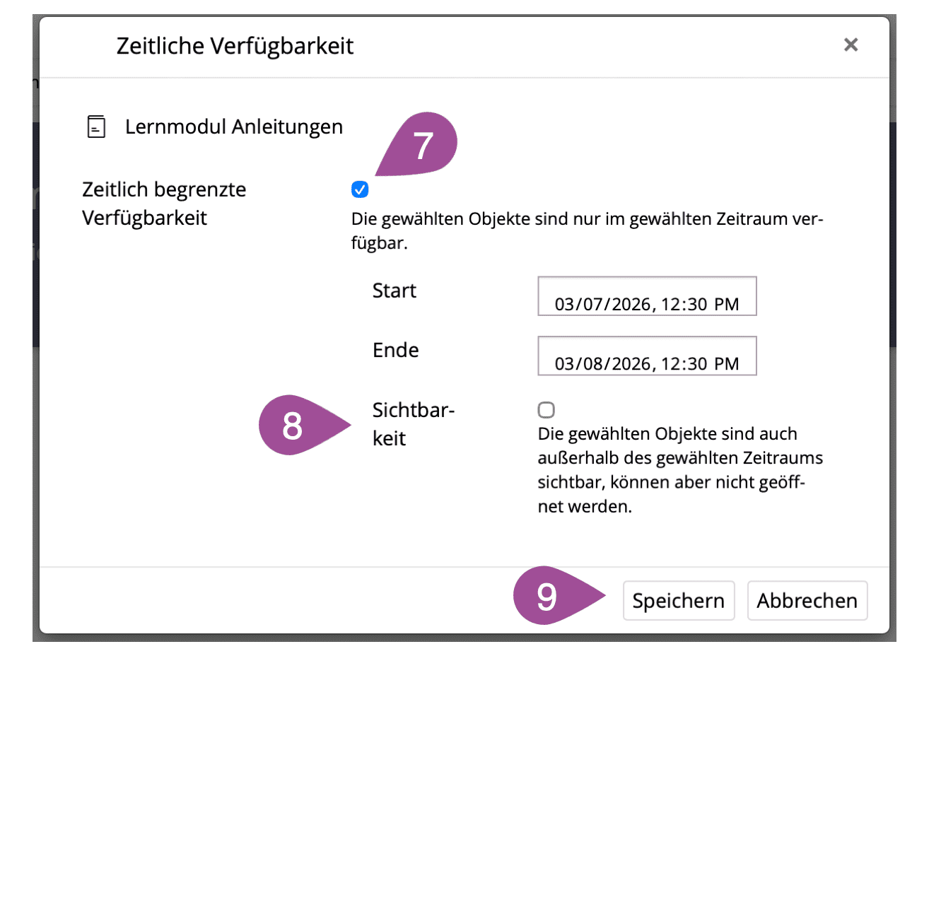 Sie können einstellen, in welchem Zeitraum auf das Lernmodul zugegriffen werden kann. Ausserhalb dieses Zeitraums kann das Lernmodul nicht aufgerufen werden.