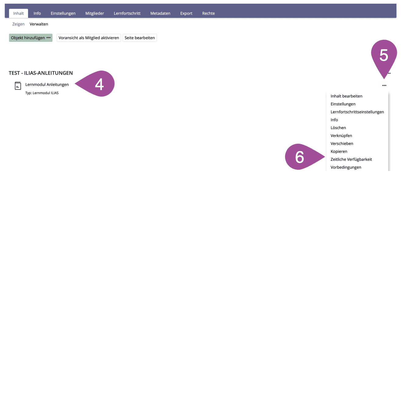 Öffnen Sie das Aktionenmenü des Lernmoduls. | |
