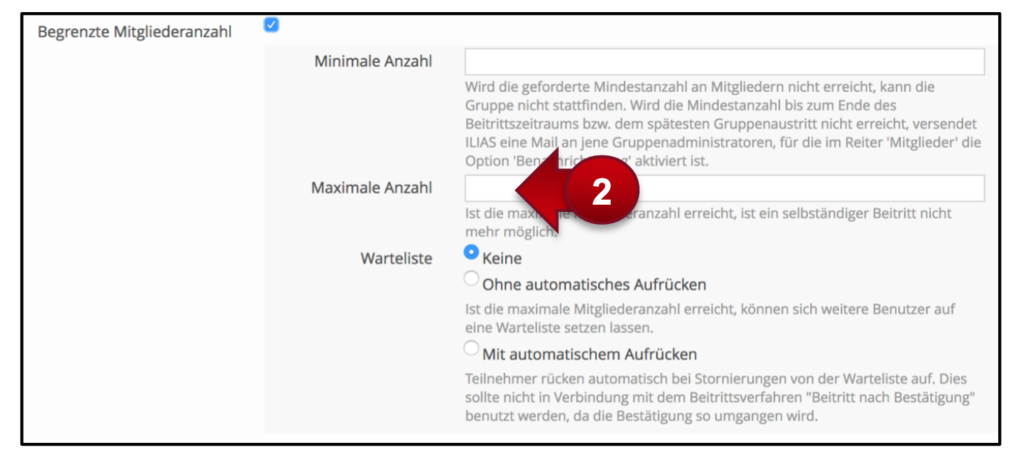 2. Um die Mitgliederzahl Ihrer Gruppe zu beschränken, geben Sie die entsprechende Anzahl in das Feld rechts neben «Maximale Anzahl» ein. Sie können optional auch eine Warteliste führen lassen. Sobald die maximale Teilnehmerzahl erreicht ist, wird ILIAS für Sie alle folgenden Anmeldungen auf eine Warteliste setzen, die Sie nach erfolgter Anmeldung manuell verwalten (es gibt kein automatisches Nachrücken von der Warteliste).