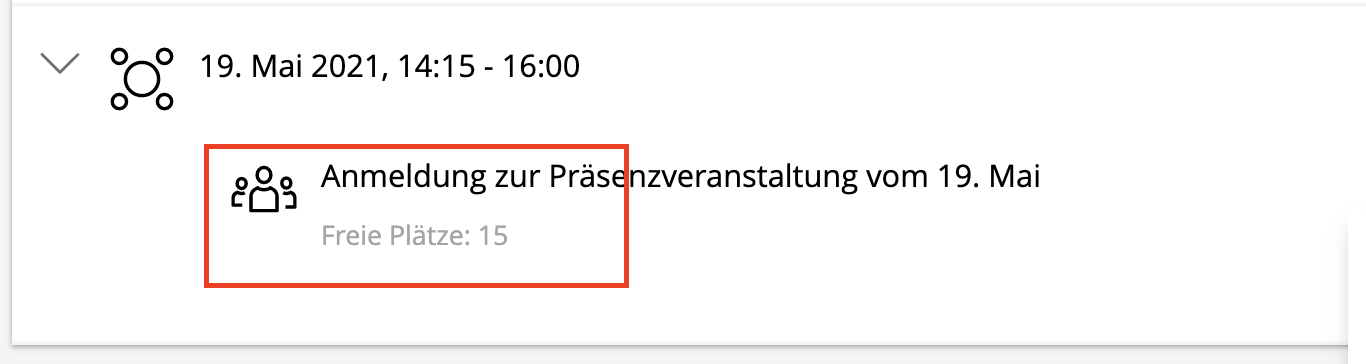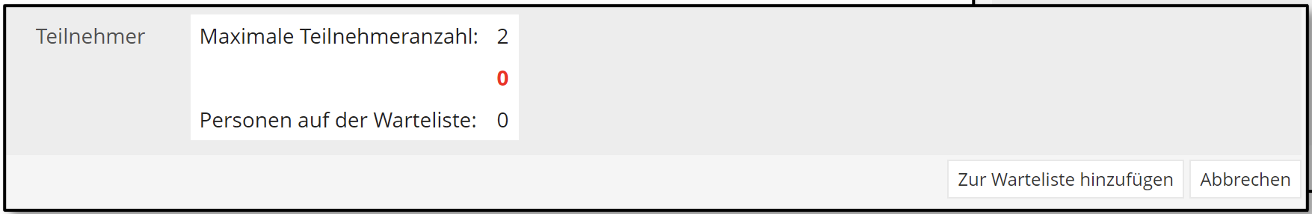 3. Den Studierenden wird nun vor der Anmeldung angezeigt, wie gross die maximale Teilnehmerzahl ist und wie viele Plätze noch frei sind. Sofern die Option von Ihnen in den Einstellungen aktiviert wurde haben die Studierenden nach Erreichen der maximalen Teilnehmerzahl die Möglichkeit, sich auf eine Warteliste eintragen zu lassen (Klick auf "Zur Warteliste hinzufügen")