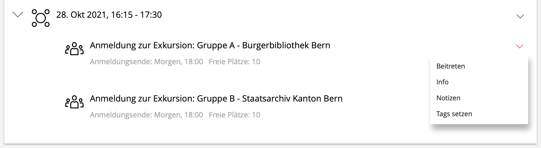 Erstellen Sie an der gewünschten Stelle, z.B. in einem ILIAS-Termin, eine oder mehrere Gruppen und setzen Sie eindeutige Titel. z.B. "Anmeldung zur Exkursion: Gruppe A - Burgerbibliothek Bern ".