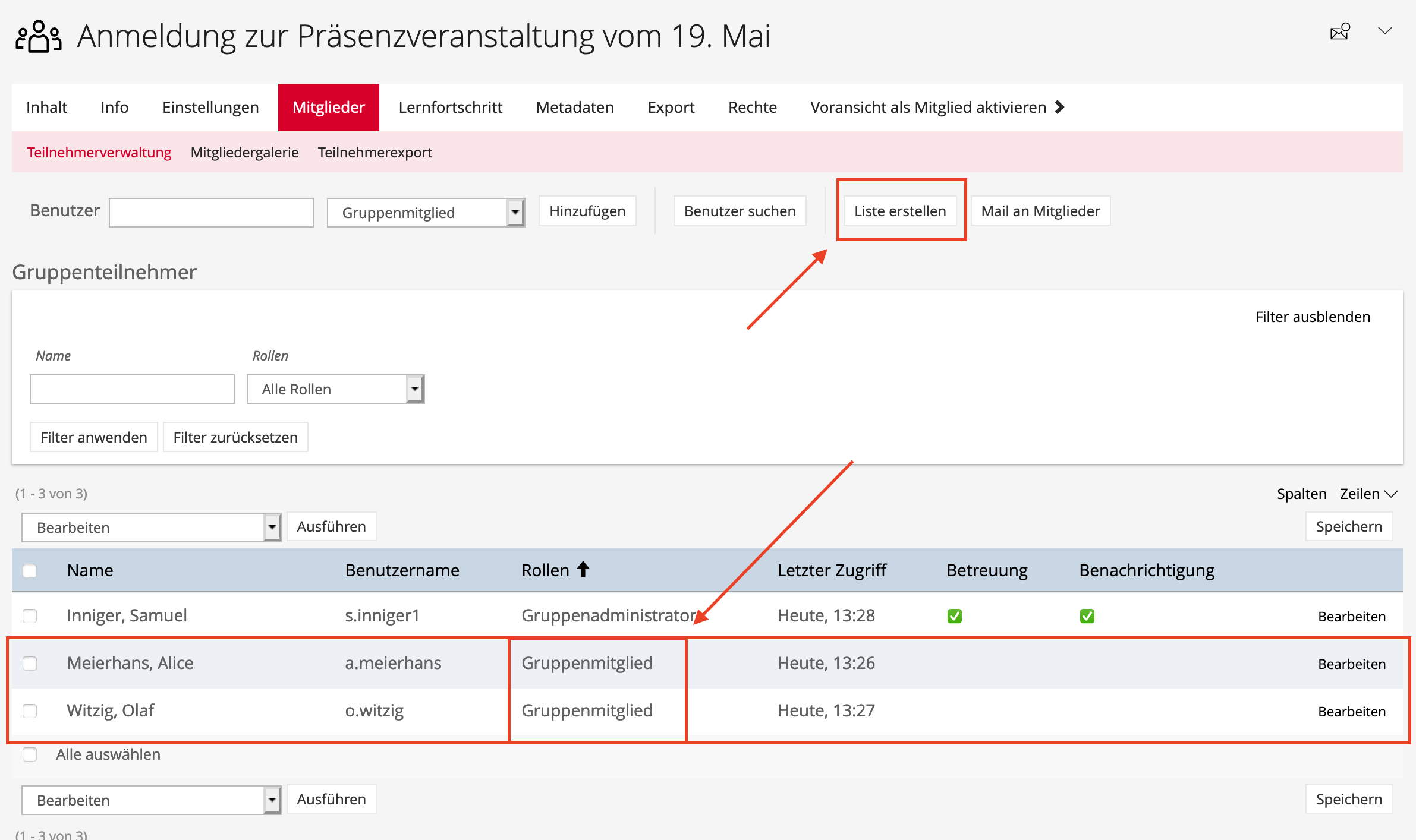 Um an die detaillierte Auflistung aller Anmeldungen zu gelangen, müssen Sie die Gruppe öffnen und den Tab «Mitglieder» aufrufen. Sie sehen nun auf einen Blick die angemeldeten Benutzer (--> Rolle Kursmitglied). Mit einem Klick auf den Button "Liste erstellen" können Sie sich eine Druckansicht der Anmeldungen anzeigen lassen.