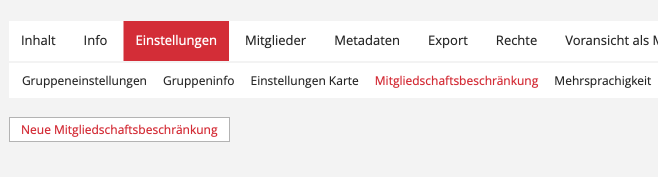 1. Öffnen Sie eine der Gruppen, und öffnen Sie im Tab "Einstellungen" den Untertab "Mitglieschaftsbeschränkung".