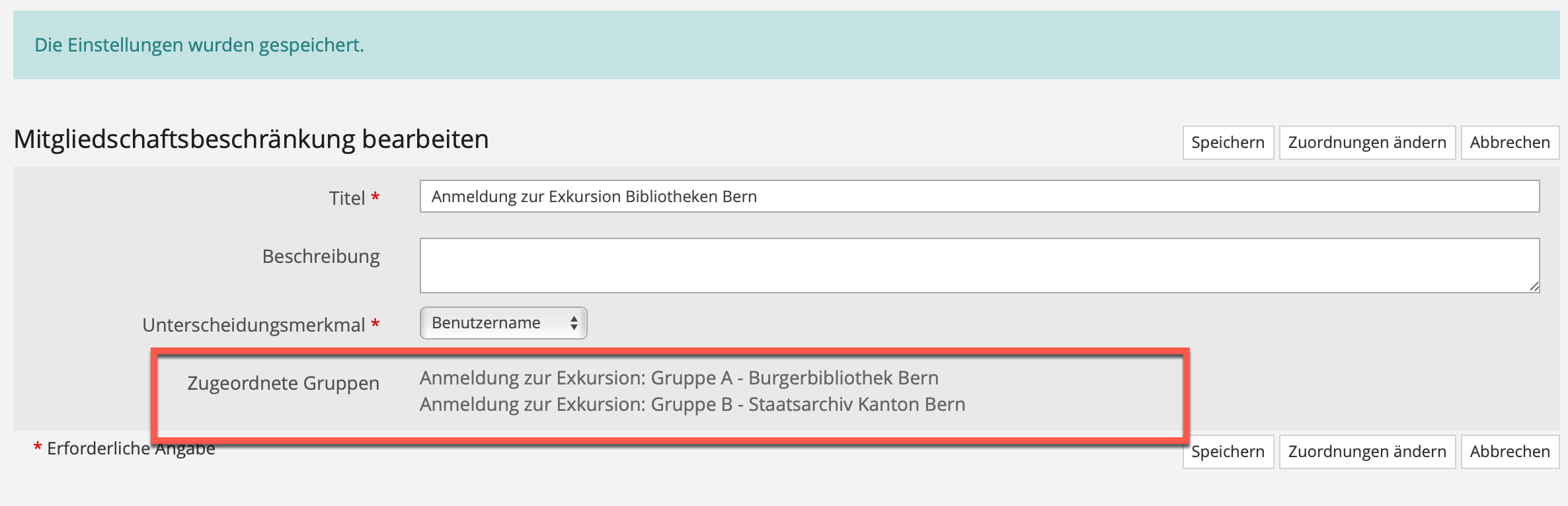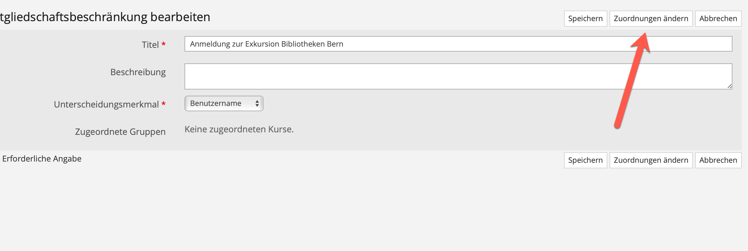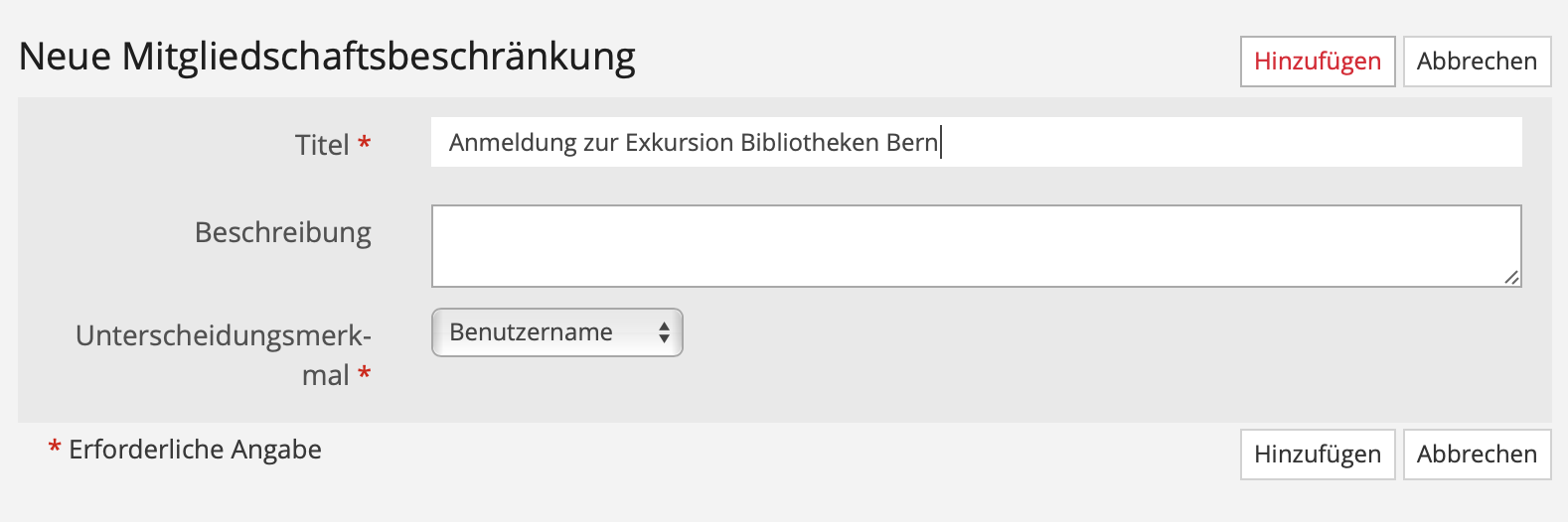 2. Setzen Sie einen Titel für die Mitgliedschaftsbeschränkung. z.B. "Anmeldung zur Exkursion Bibliotheken Bern". Speichern Sie die Eingabe mit "Hinzufügen"