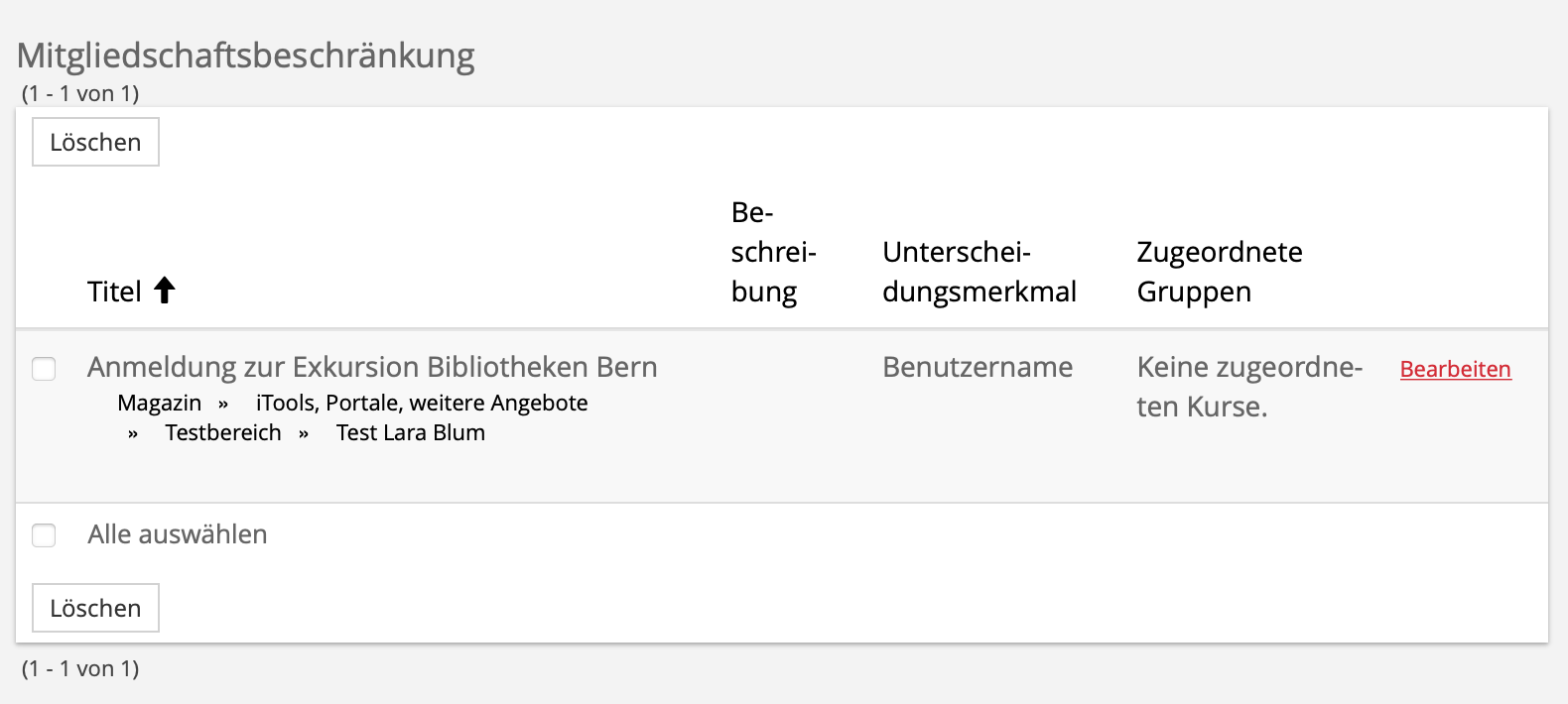 3. Die Mitgliedschaftseinschränkung wird Ihnen in der Listenansicht angezeigt. Klicken Sie in der rechten Spalte auf "Bearbeiten"