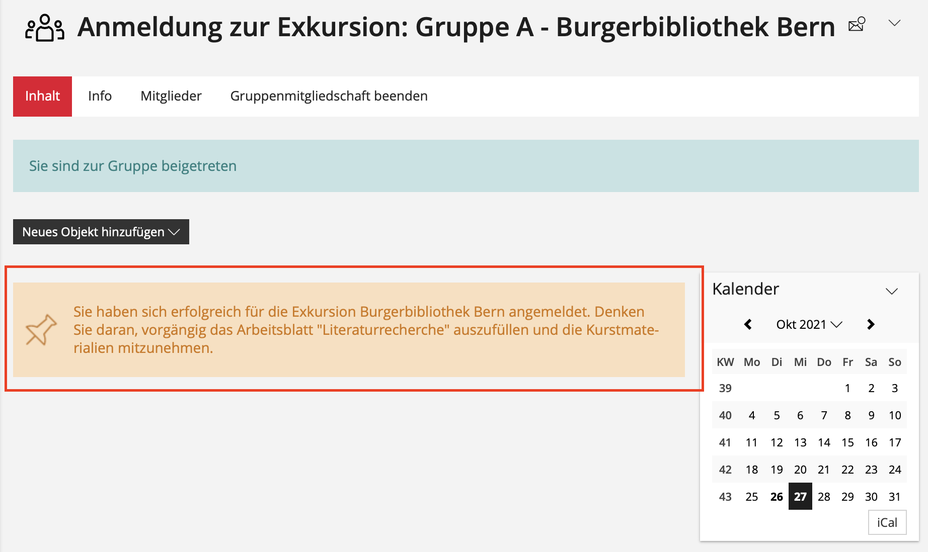 Sollten Sie die Gruppe ausschliesslich für die Anmeldung benutzen, schalten Sie in der Gruppen mit der Funktion "Seite gestalten" am besten einen kurzen Texthinweis, der den Studierenden die Anmeldung zum Termin bestätigt. In unserer Anleitung "Erscheinungsbild von Kursen gestalten" ab Seite 8 finden Sie weitere Informationen zum Vorgehen.