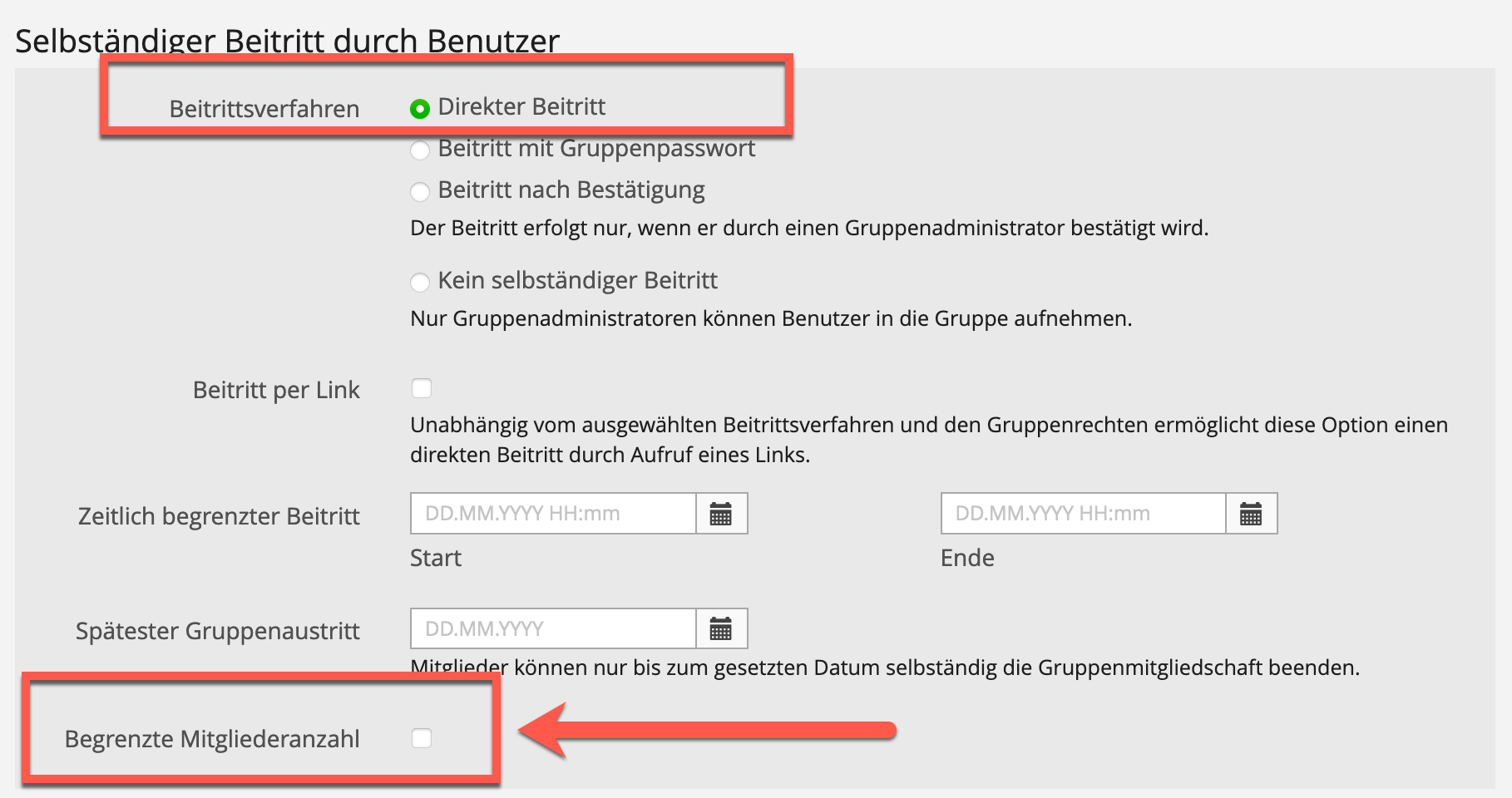 1. Öffnen Sie den "Einstellungen"-Tab der Gruppe(n) und wählen Sie im Abschnitt "Selbständiger Beitritt durch Benutzer" das Beitrittsverfahren "Direkten Beitritt" an. Weiter unten klicken Sie auf "Begrenzte Mitgliederanzahl". Sofort erweitert sich das Feld und Sie erhalten weitere Einstellungsmöglichkeiten.