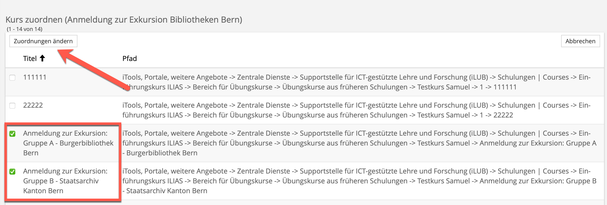 4. Klicken Sie nun auf "Zuordnungen ändern". Es öffnet sich eine (unter Umständen lange) Auflistung mit allen Gruppen, für die Sie als Administrator eingeschrieben sind.