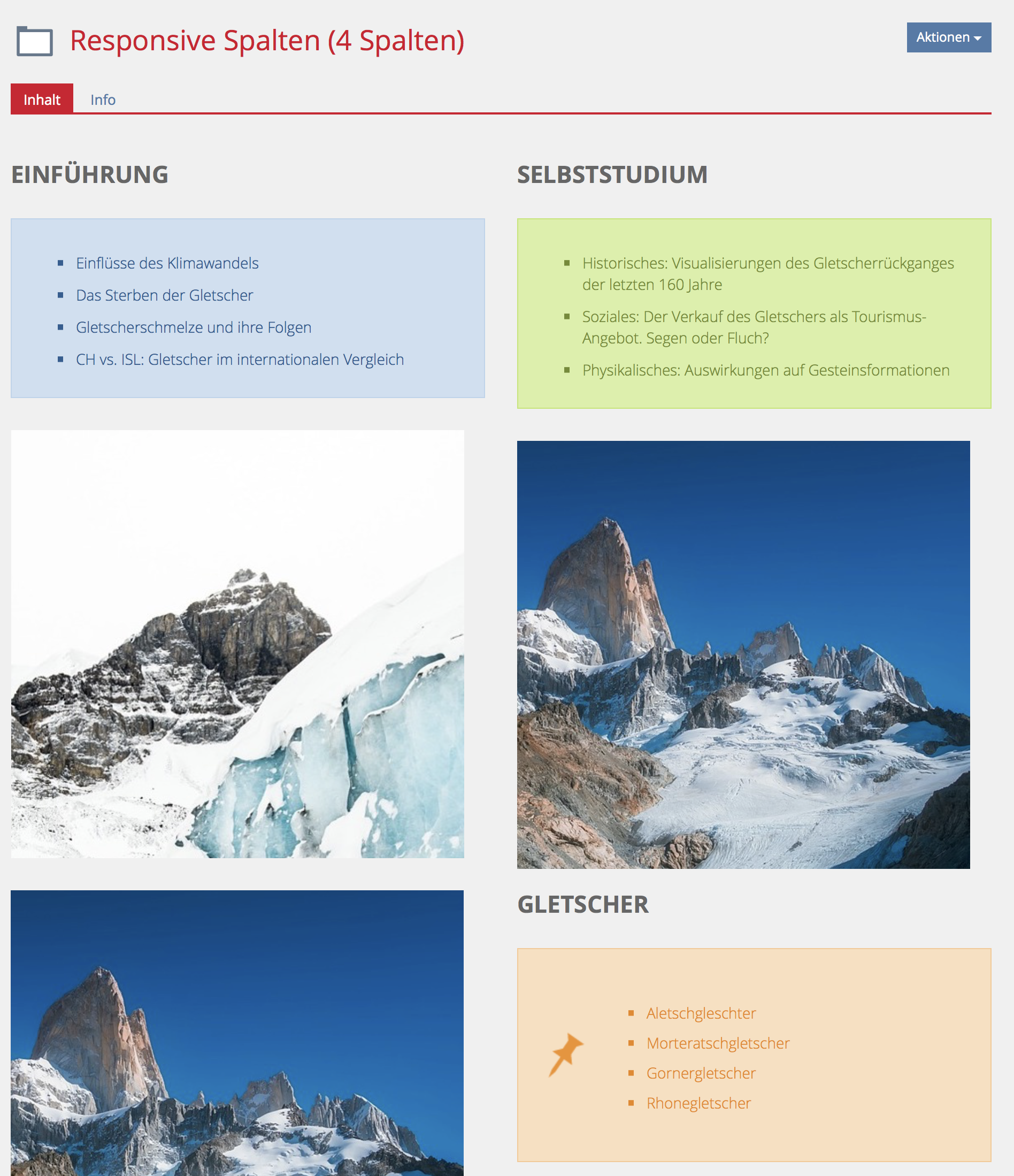 Wer bisher Inhalte – sei es im ILIAS-Kurs, im Lernmodul oder auch im Wiki – nebeneinander platzieren wollte, hat sich mit erweiterten Tabellen ausgeholfen. Diese hatten aber das Problem, dass auf kleinen Bildschirmen (z.B. Smartphones), die Inhalte nebeneinander blieben und man seitlich scrollen musste. Das muss nun nicht mehr sein.