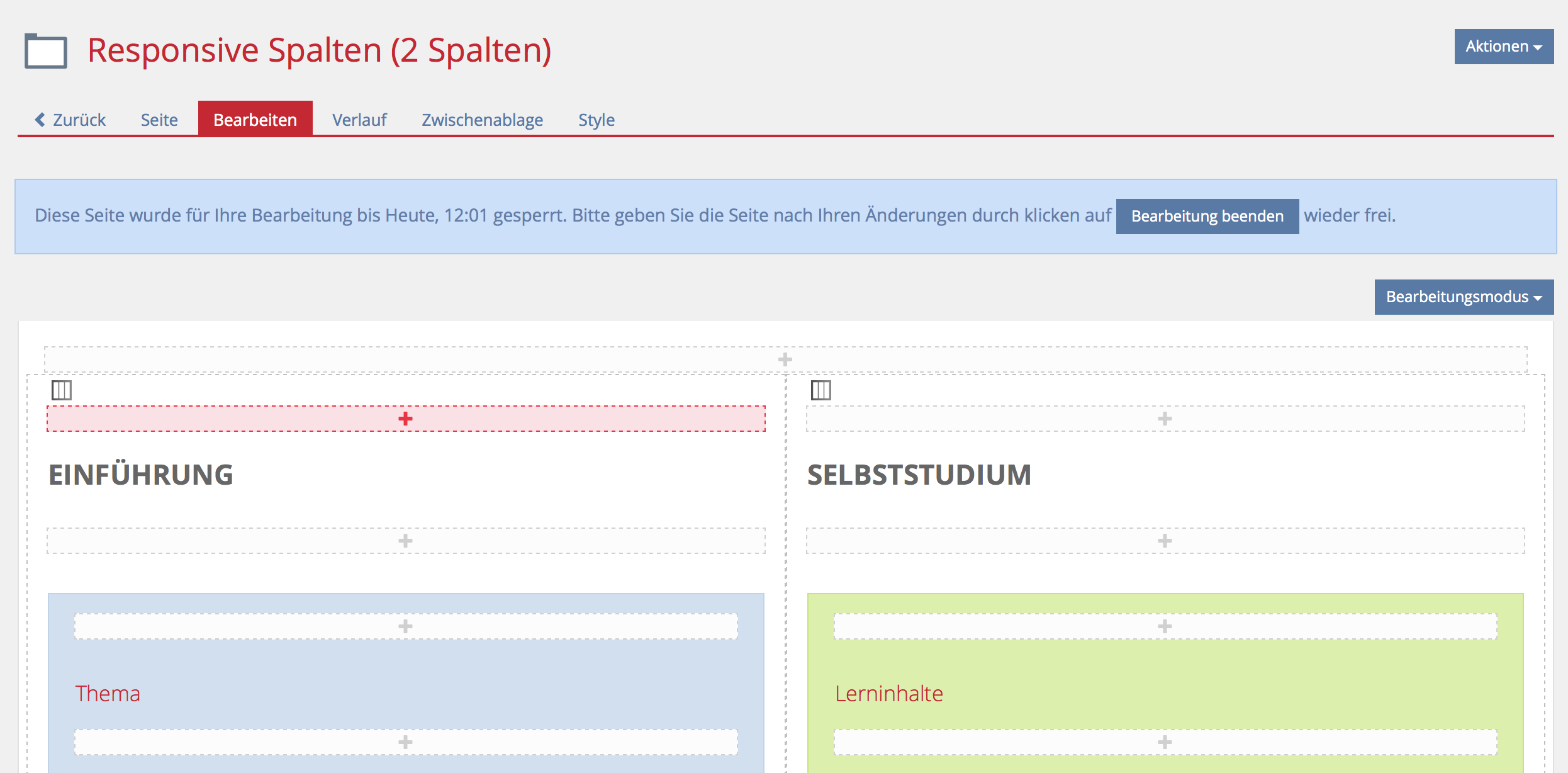 - Sie sehen nun die eingefügten Spalten. Klicken Sie auf einen Balken mit +, um ein neues Inhalts-Element hinzuzufügen (z.B. Text).