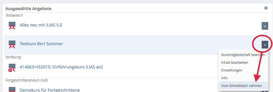 Unter "Persönlicher Scheibtisch > Übersicht" kann selber entschieden werden, welche Kurse bzw. ILIAS-Objekte angezeigt werden sollen. Sind Kurse vorhanden, auf die Sie aktuell nicht mehr zugreifen wollen, so können Sie diese über "Aktionen > Vom Schreibtisch nehmen" von dieser Übersicht entfernen.