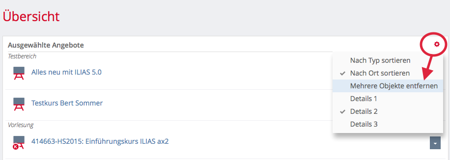 Tipp: Entfernen Sie gleich mehrere Kurse gleichzeitig von Ihrem Schreibtisch. Klicken Sie dazu auf das Einstellungen-Symbol der «Ausgewählten Angebote» und wählen Sie «Mehrere Objekte entfernen».