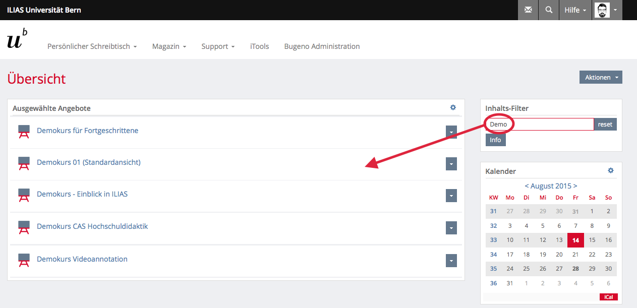 Update vom 24.09.2015: In Ihren persönlichen «Einstellungen» können Sie festlegen, was Sie als Startseite sehen wollen, wenn Sie sich in ILIAS einloggen. Standardmässig ist die «Übersicht» ausgewählt, Sie können aber auch entscheiden, dass Sie nach dem Login den «Kalender» oder ein beliebiges Magazin-Objekt (z.B. einen Kurs) als Startseite auswählen. Unter: Persönlicher Schreibtisch > Einstellungen > Startseite