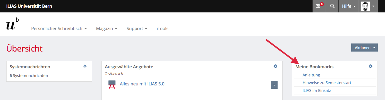 Update vom 01.09.2015: Auch die Bookmarks ermöglichen es, dass Sie eigene interne Links erstellen können. Sie erhalten so einen schnellen Zugriff auf Seiten innerhalb von ILIAS über Ihren Persönlichen Schreibtisch (siehe unten).