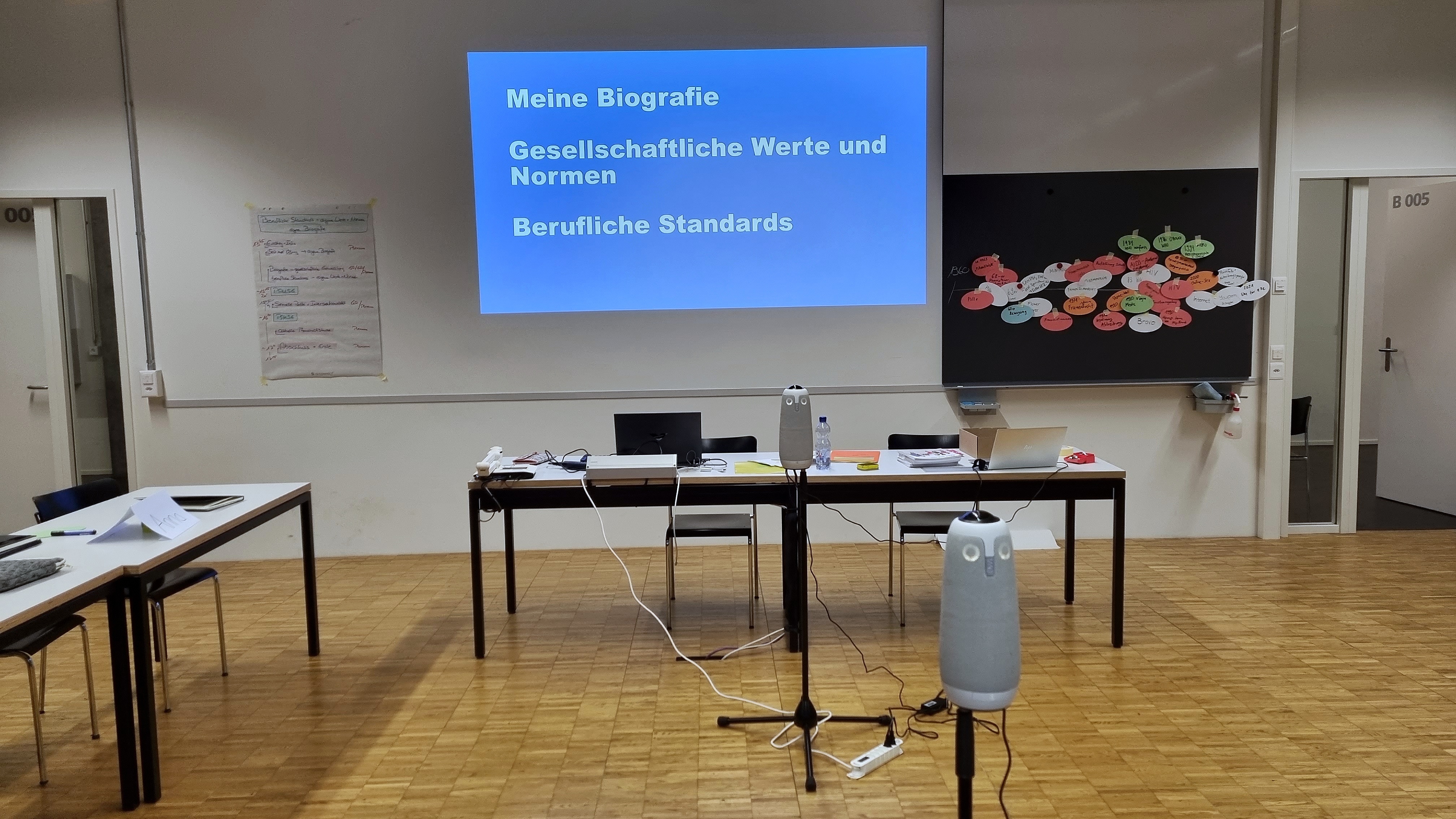 Ein Teil der Studierenden ist in Präsenz anwesend und ein Teil wird online zugeschaltet. Gruppenarbeiten werden medienübergreifend organisiert