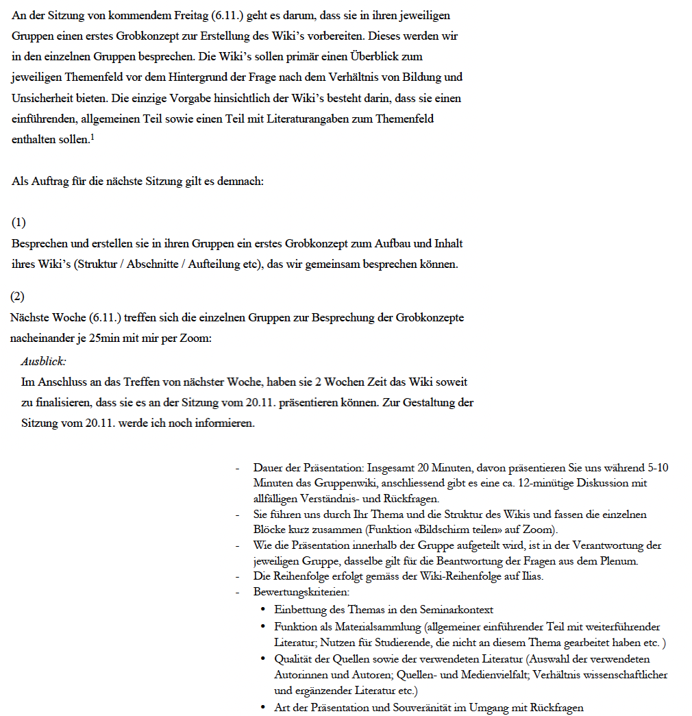 - Den Kursteilnehmenden wird die Aufgabe erteilt, in Gruppen zu bestimmten Themen WIKI-Beiträge im LMS ILIAS zu verfassen. Dabei kann ein Teil der Aufgabe darin bestehen, die Struktur für die einzelnen Artikel oder auch den Aufbau des WIKIS selbst zu entwickeln. Einfacher wird die Aufgabe, wenn Sie eine Struktur (der Artikel oder des gesamten WIKIS) bereits zum Teil vorgeben. Damit sinkt aber auch der Lernerfolg, weil die Studierenden nicht gezwungen sind, sich sowohl vertieft als auch in den Gesamtzusammenhang eines Themas einzuarbeiten.