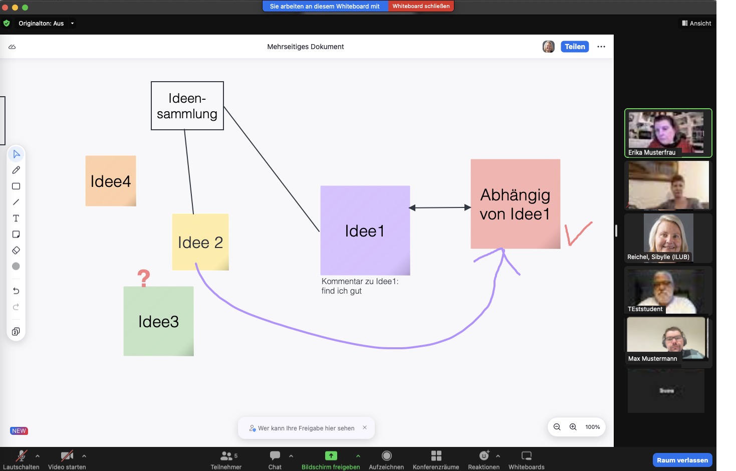 - Ein Zoom-Whiteboard bietet sich an, wenn ohnehin Zoom verwendet wird. Das Zoom-Whiteboard bietet mehr Funktionen als ein Etherpad.