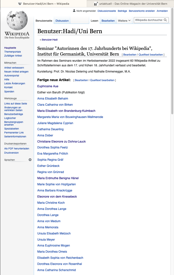 Im Kursprojekt entstandene Wikipedia-Seiten