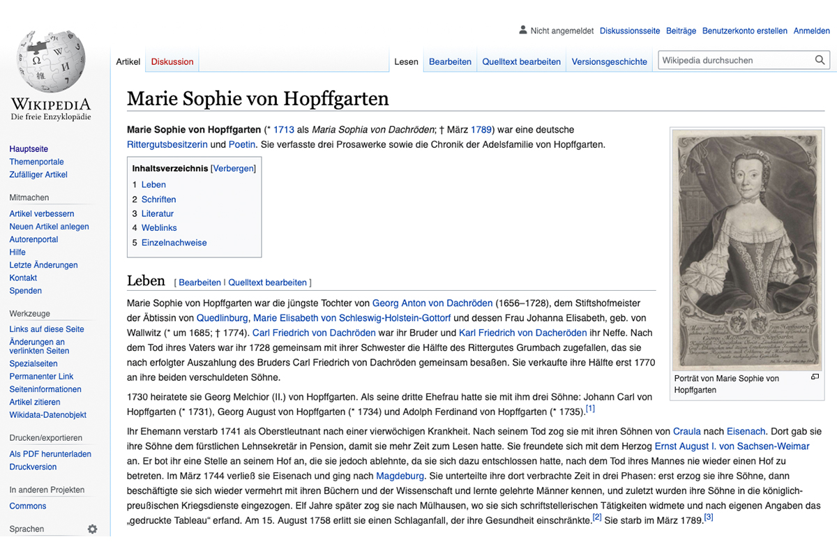 Screenshot des im Seminar verfassten Wikipedia-Eintrags zur Schriftstellerin Marie Sophie von Hopffgarten: