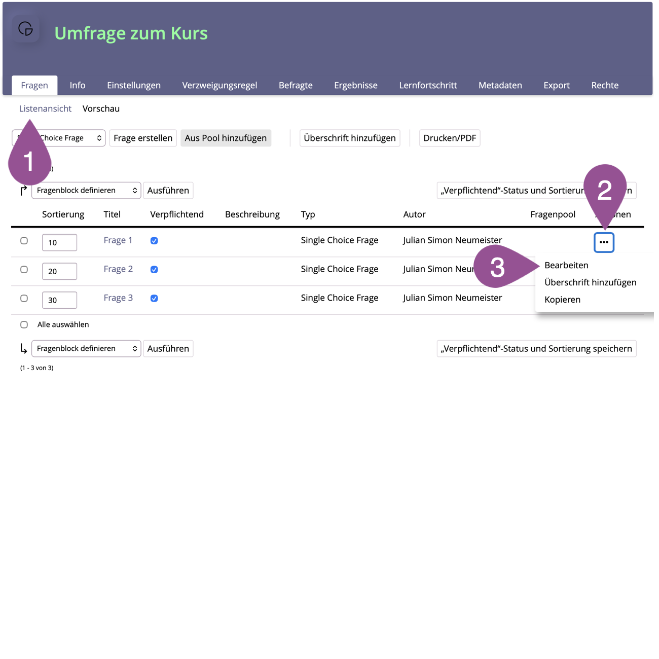 Gehen Sie zum Register «Fragen». Wenn Sie die Frage direkt in der Umfrage erstellen, gehen Sie anschliessend zum Sub-Register «Listenansicht». | |