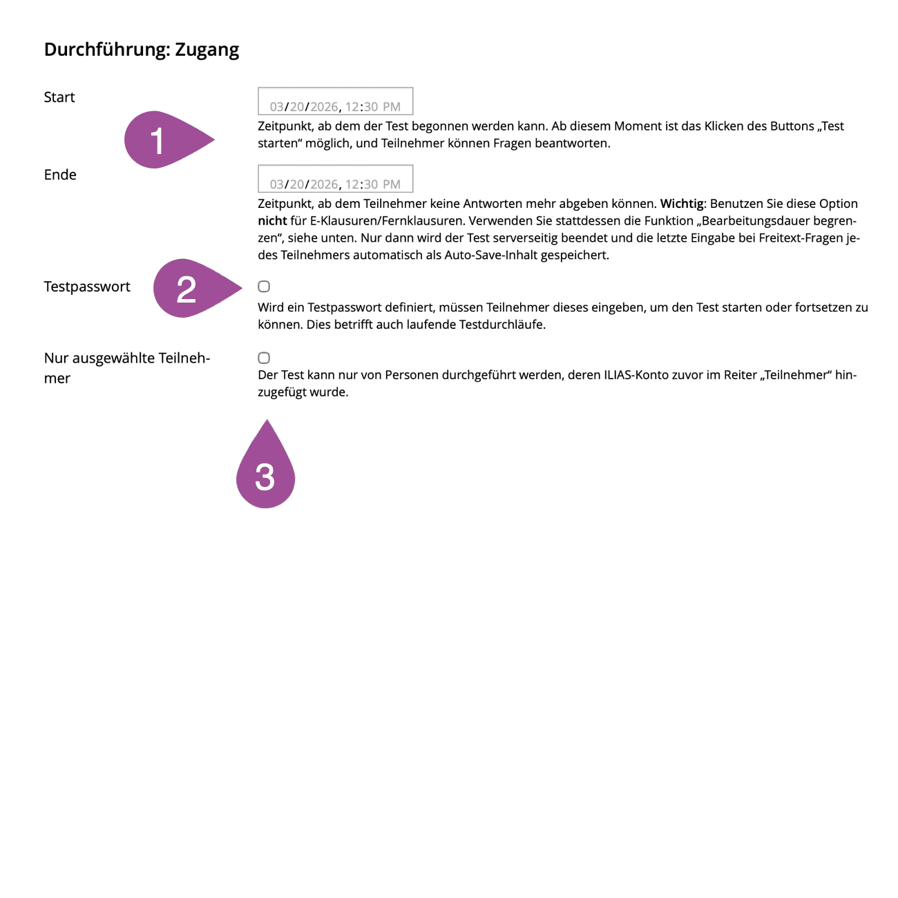 Sie können einen Zeitraum angeben, während dem der Test ausgefüllt werden kann. Ausserhalb dieser Zeit kann der Test nicht aufgerufen werden. | |