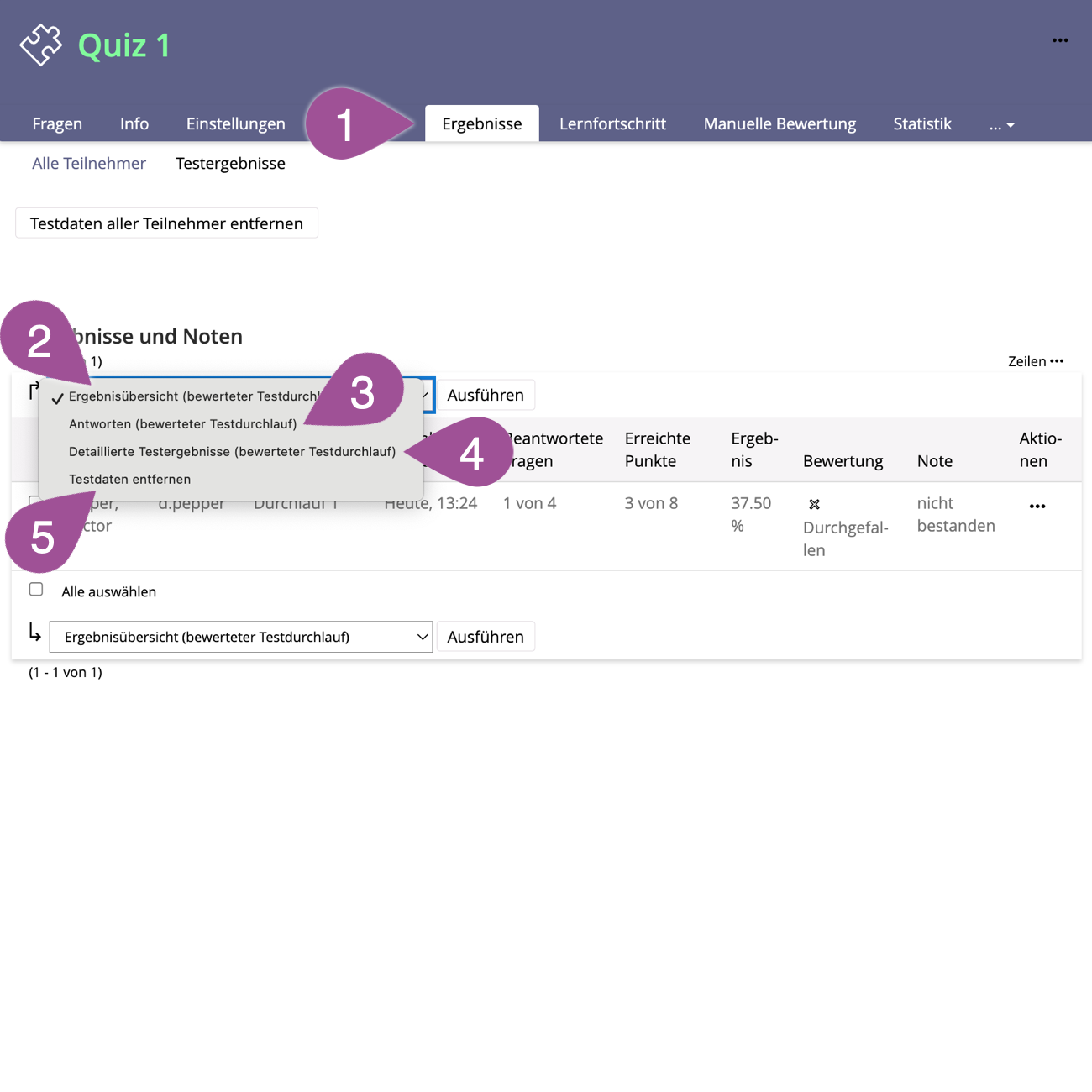 Es gibt drei Möglichkeiten, die Testergebnisse der Teilnehmenden einzusehen und/oder zu verwalteten: die «Ergebnisse», die «Statistik» und den «Export».