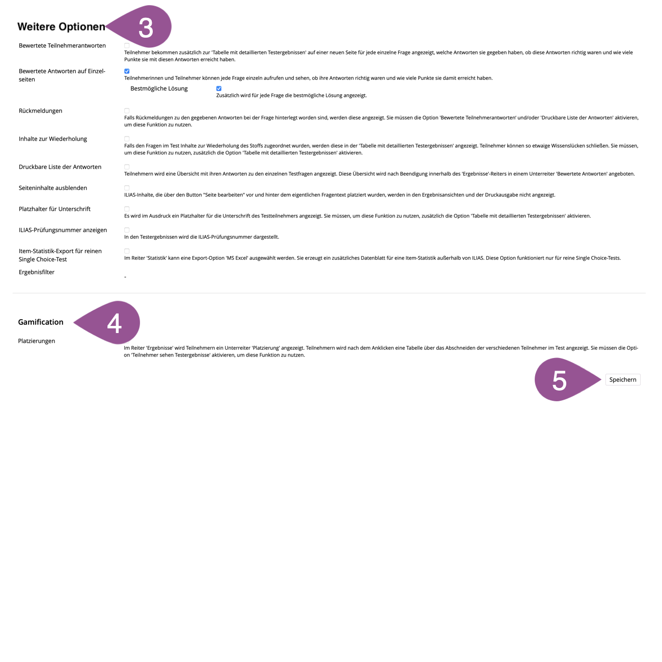 The ILIAS test is quite complex and therefore offers many setting options, which are divided into 3.1 General, 3.2 Grading System, 3.3 Scoring & Results, 3.4 Certificat and 3.5 Personal Default Settings.