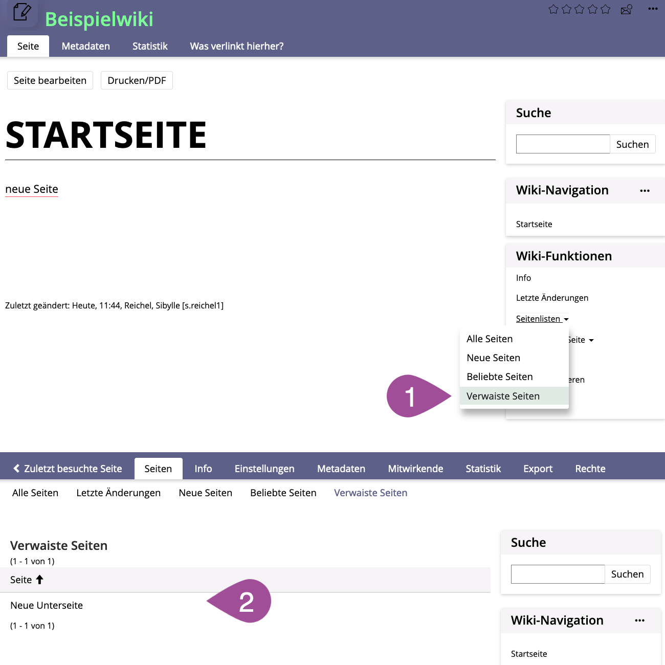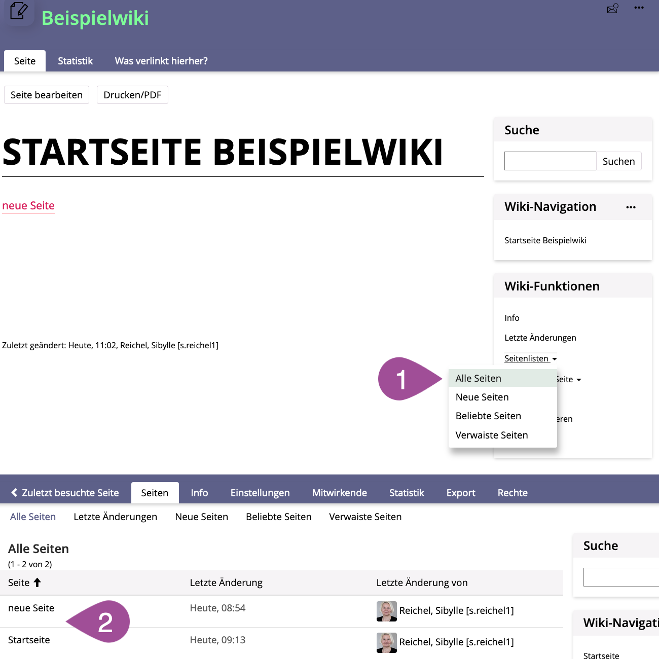 In the «Wiki Navigation», you can list all or selected (important) wiki pages in a three-level hierarchy so that related pages can be easily identified. The wiki navigation is visible on every page and all pages listed there are linked for quick access.