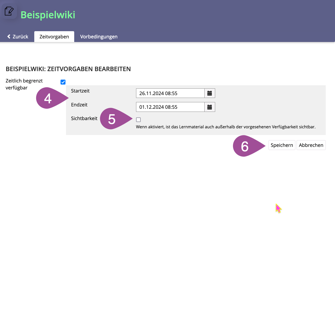 Activate the «Temporarily available» option and enter the period during which you want the wiki to be accessible. | |