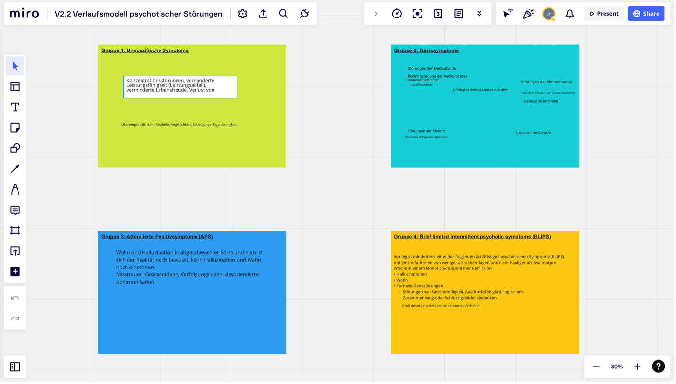 Im Seminar „Früherkennung und Prävention von Psychose bei Jugendlichen und jungen Erwachsenen mit erhöhtem Psychoserisiko“ [1] im HS 2022, haben wir Gruppenarbeiten auf Miro erstellt und während der Veranstaltung durchführen lassen. Das digitale und funktionale Whiteboard Miro ermöglichte eine unkomplizierte Umsetzung des kollaborativen Arbeitens. Selbst Studierende, die asynchron an der Veranstaltung teilnahmen, konnten die Arbeitsaufträge durchführen.