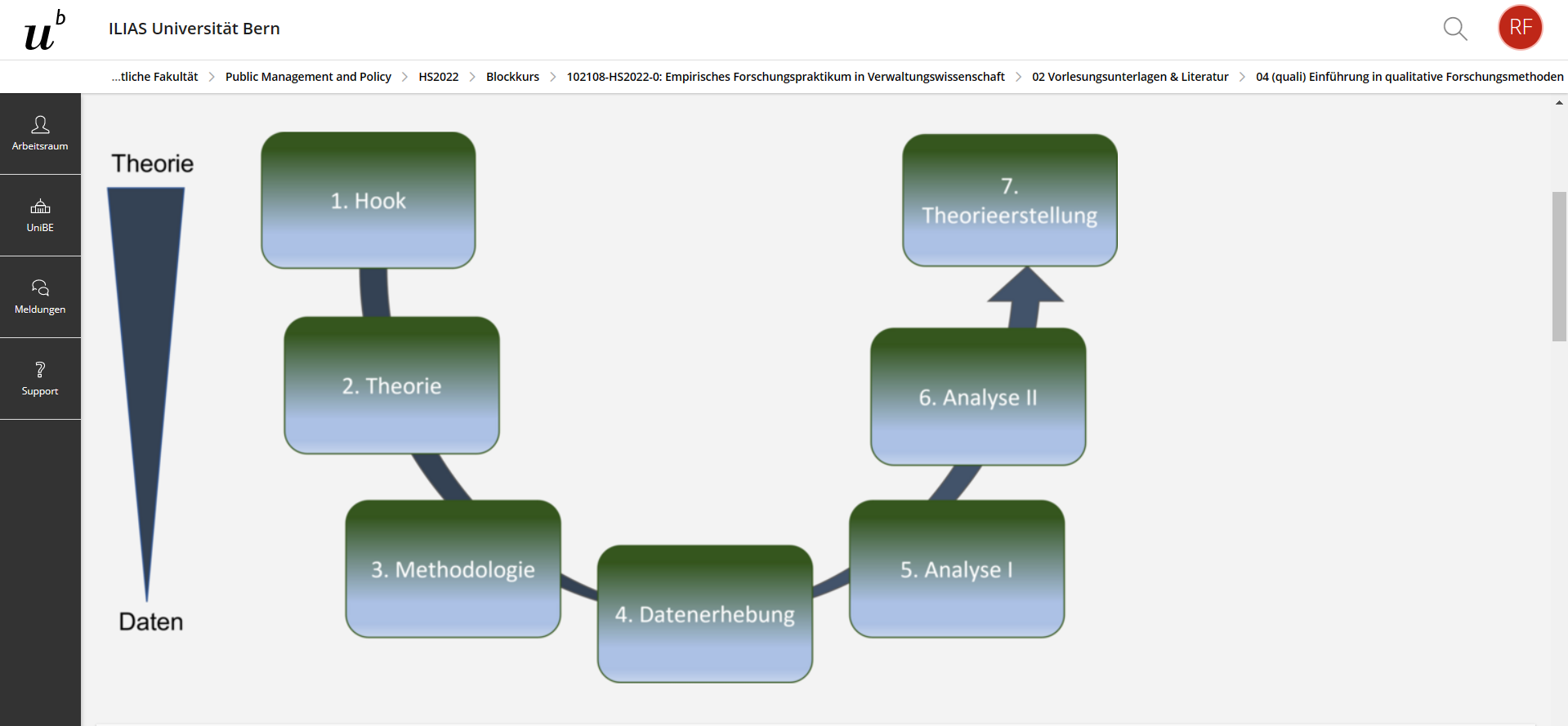 Wir haben auf der Startseite des ILIAS-Kursraumes eine Grafik platziert, auf der sieben Schritte einer qualitativen Forschungsarbeit abgebildet sind. Ein Schritt entsprach jeweils einem Vorlesungsthema. Diese Grafik war der Startpunkt jeder Vorlesungsveranstaltung. Mit einem Klick auf das entsprechende Thema, gelangten die Studierenden direkt zu den Vorlesungsfolien. Die in ILIAS erstellten Vorlesungfolien [2] haben wir je einem Vorlesungsordner zugeordnet und die Ordner auf der Startseite „versteckt“ eingebunden (nur für Personen mit Adminrechten sichtbar). Beachten Sie, dass Sie den Studierenden über die Rechte im Menü Lesezugriff auf die Ordner geben, damit sie über die Verlinkung in der Grafik Zugriff haben.