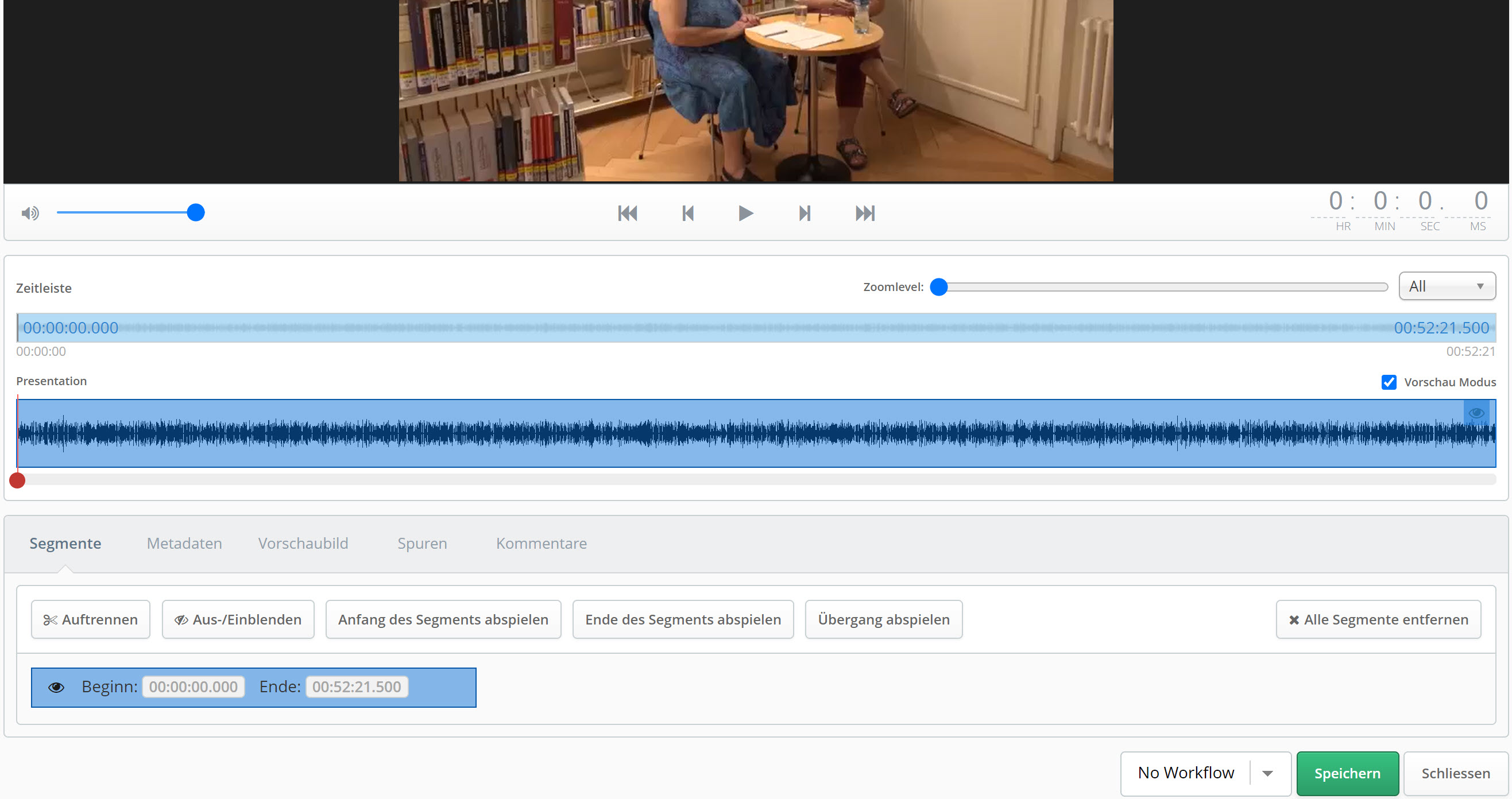 Durch die Einbettung in eine Opencast Serie wird eine bessere Performanz sichergestellt. Durch die Opencast Serie konnten wir schnell und einfach über die Zugangsrechte bestimmen und ob ein Download möglich ist oder nicht. Sollten die Studierenden im Selbststudium noch zusätzlich aktiviert werden, ist es möglich, die Opencast Serie in ein Interaktives Video [5] mit Fragen und Kommentarmöglichkeit einzubauen. Informieren Sie sich unbedingt über die Datenschutzbestimmungen an Ihrem Institut und holen Sie das Einverständnis Ihrer Interview-Partner:innen ein.