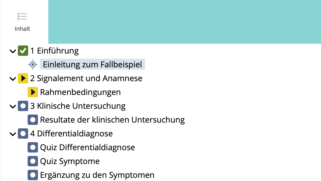 Die einzelnen Kapitel in der Navigationsleiste sichtbar zu machen, ist für die Studierenden hilfreich. So haben sie einerseits einen Überblick über alle Kapitel, andererseits können sie ihren letzten Bearbeitungsstand abrufen und weiterfahren.