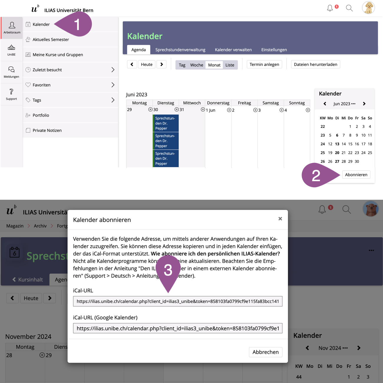 Diese Anleitung informiert darüber, wie Sie die Sprechstunden-Funktion des ILIAS-Kalenders nutzen können, und wie der Kalender in einem externen Kalenderprogramm abonniert werden kann. Informationen zum KSL Kalenderabonnement finden Sie im KSL Handbuch ab S. 482.