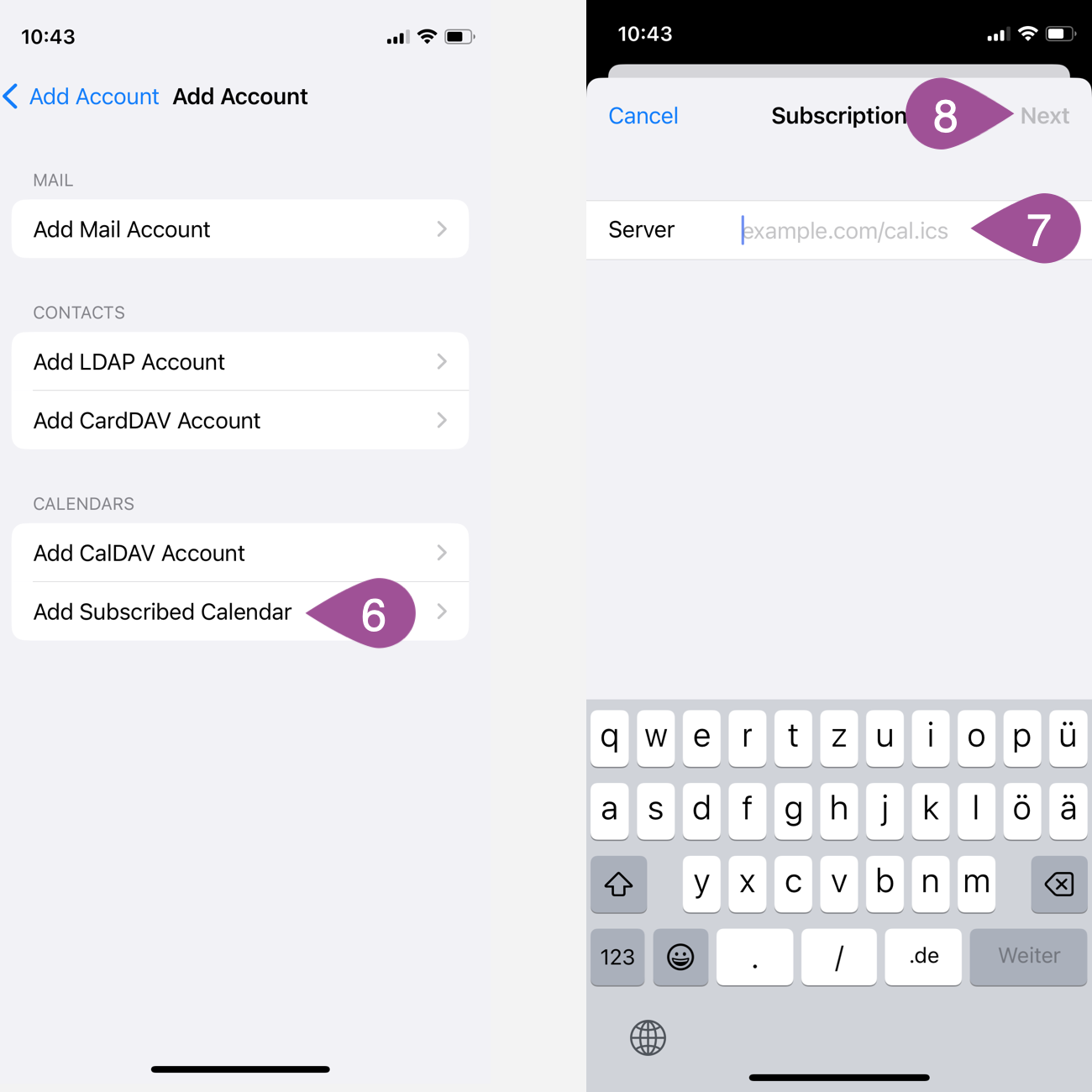Wenn Sie zum Einrichten keinen Mac haben (macOS), können Sie die iCal-URL direkt in den Einstellungen Ihres iPhones abonnieren. Der iPhone Kalender aktualisiert das Kalenderabonnement nach jedem Neustart des Kalenders.