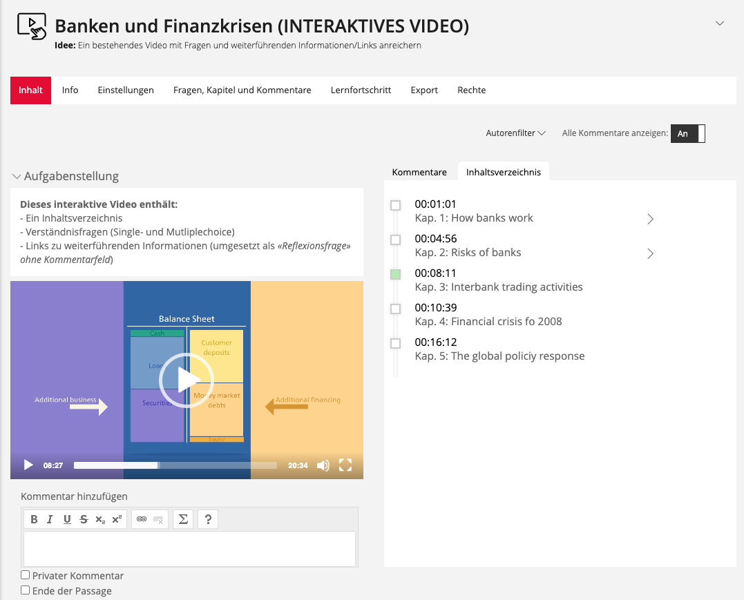 Ein Objekt zum Anreichern von Videos mit Inhaltsverzeichnis, Fragen und Kommentarfunktion.