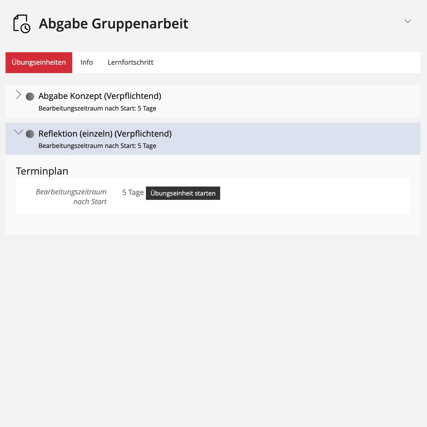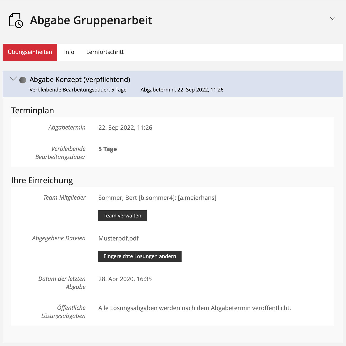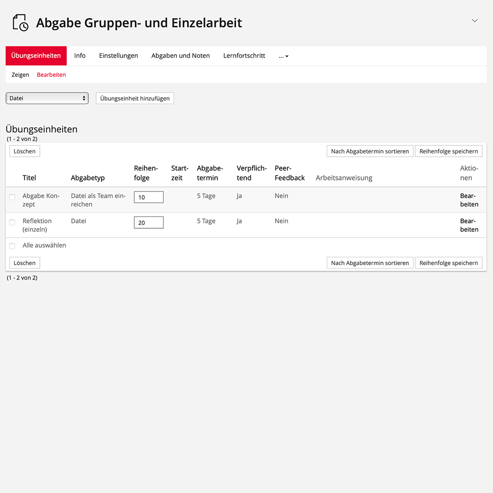 - In der Übung wird eine Übungseinheit des Typs "Datei als Team einreichen" erstellt