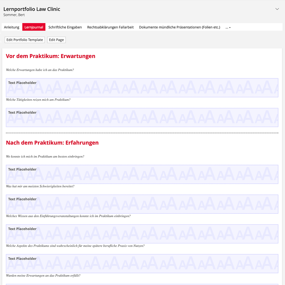 Aus Studierendensicht: Über den Seiteneditor werden die Platzhalter mit den entsprechenden Inhalten gefüllt